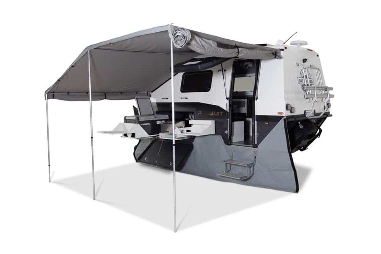 El BRS Offroad Pursuit puede parecer modesto por fuera, pero no subestimes lo que contiene por dentro. Cuando abres la puerta, encuentras un ambiente de lujo que invita a saltar en la impresionante cama de matrimonio. Los detalles reconfortantes incluyen una enorme ventana en la azotea, un sistema de entretenimiento, Wi-Fi, una ducha deslizante totalmente cerrada, asientos reclinables, calefacción y aire acondicionado. Además, incluye una nevera-congelador Waeco, una parrilla de barbacoa al aire libre, un sistema de batería Enerdrive y paneles solares monocristalinos de 300W.