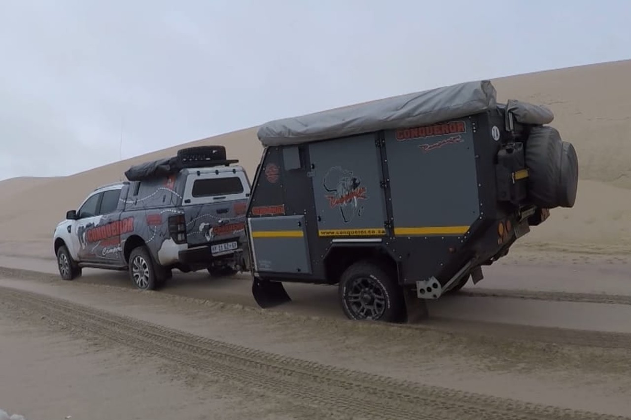 En este caso, tenemos un remolque militar, inspirado en una tienda de campaña. Cuenta con una cocina deslizable, una nevera-congelador SnowMaster, una gran zona de ducha al aire libre, un techo emergente, dos bidones, un toldo de despliegue rápido y amplios compartimentos de almacenamiento. Entre las comodidades que ofrece, destacan una cama extraíble, un comedor con dos bancos, una cama Queen configurable, un estante para vinos, aire acondicionado y un centro multimedia. Tiene un diseño aeronáutico y los paneles están recubiertos de polvo para protegerlos de posibles arañazos y golpes.