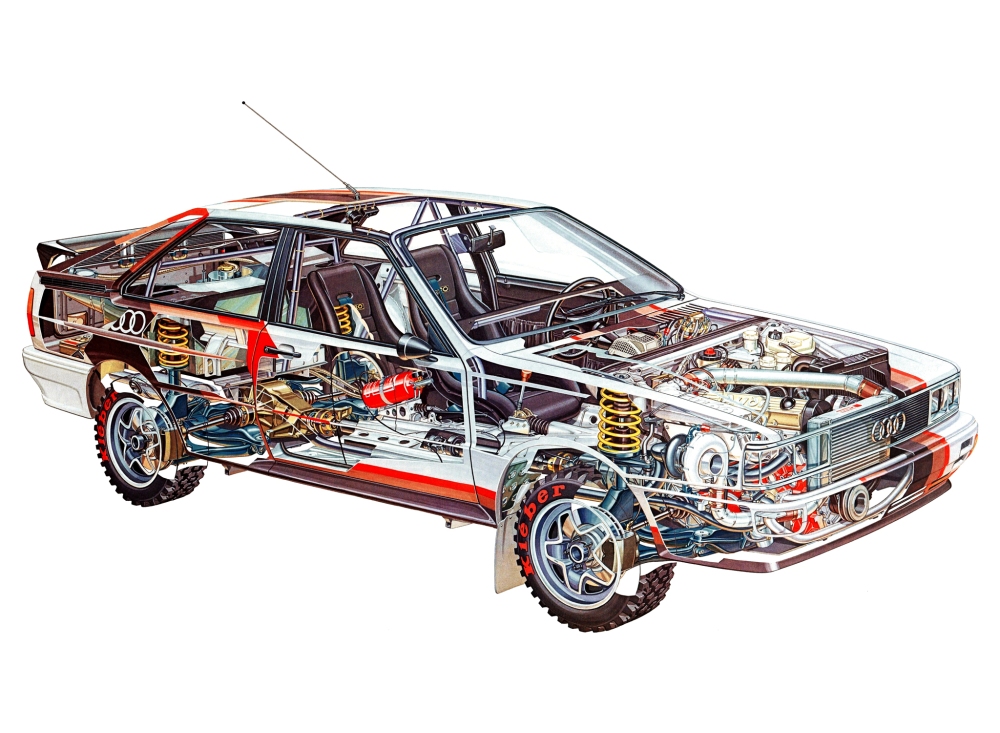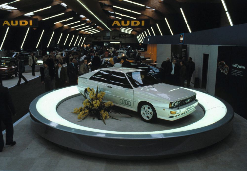 No sería hasta el Salón de Ginebra de 1980 cuando esta nueva tecnología se mostrase en un vehículo de producción, el Audi quattro. Este elegante coupé de líneas angulosas estaba equipado con un motor de cinco cilindros sobrealimentado de 200 CV y, aunque inicialmente su producción se limitaría a unas pocas unidades, fue tal su éxito comercial que terminó formando parte de la gama de modelos de Audi hasta 1991.