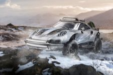 Por último, no podía faltar el nuevo Porsche 911 GT2 RS, el cual cambia los circuitos por las heladas cordilleras de algún paraje inóspito. La suspensión se ha elevado, los guardabarros se han modificado para albergar sus nuevas llantas y neumáticos todoterreno, tres barras de luz LED en el techo y el frontal, ruedas de repuesto en l aparte posterior (no sabemos cómo afecta esto al compartimento del motor) y un peldaño para acceder al interior, y ya tenemos el primer 911 off-road de la historia, con permiso del Porsche 959 del Dakar.