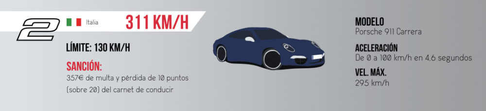 Los Carabinieri detuvieron a este conductor mientras llevaba su Porsche 911 Carrera a 311 km/h en una autopista italiana que está limitada a 130 km/h. Las consecuencias de esta infracción fue la retirada de 10 puntos de un total de 20 puntos que tiene el carné en Italia y una multa de 357 euros.