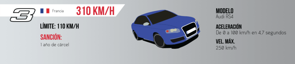 En octubre de 2011, un conductor francés fue detenido por la policía mientras conducía a 310 km/h su Audi RS4 modificado en una zona limitada a 110 km/h. El propietario de este Audi aplicó algún tipo de modificación que permitía ‘burlar’ la limitación electrónica de velocidad máxima de fábrica, que se establece en 250 km/h. Un año de prisión fue el resultado de esta temeridad.