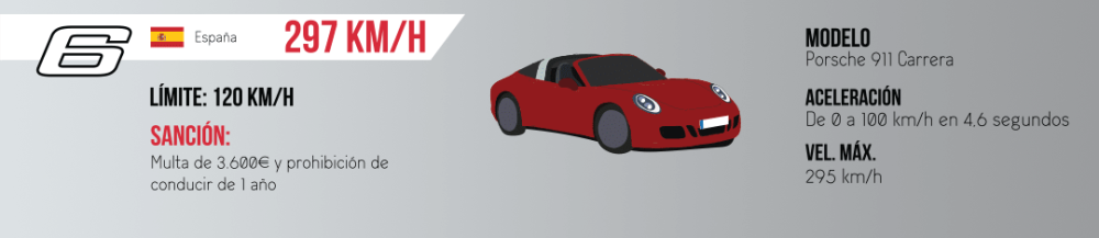 En esta ocasión, el sexto puesto fue registrado en España con un Porsche 911 Carrera a 297 km/h mientras circulaba por la R-4 que está limitada a 120 km/h. El infractor fue pillado en marzo de 2016 por un radar de la Agrupación de Tráfico de la Guardia Civil y, posteriormente, acusado de un delito contra la seguridad del tráfico, con el agravante de que disponía de un permiso de conducción para vehículos adaptados. Este tipo de carné limita la velocidad a 100 km/h, por lo que tuvo que enfrentarse a un año de retirada del carné y una multa de 3.600 euros.