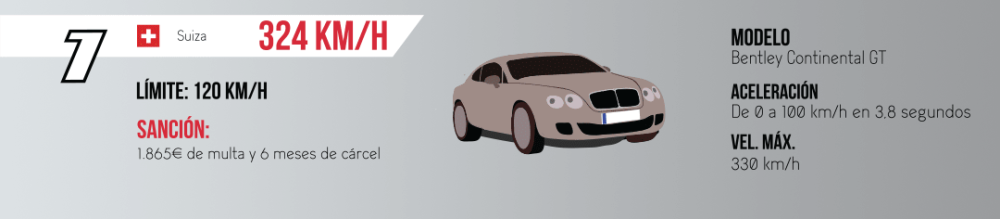 El primer puesto de este lamentable ranking se lo lleva este Bentley Continental GT (prueba) que fue registrado por un radar de Suiza en abril de 2011 mientras circulaba a 324 km/h. El tramo en el que fue cazado este conductor estaba limitado a 120 km/h y las autoridades helvéticas lo sancionaron con una multa de 1.865 euros y seis meses de prisión.
