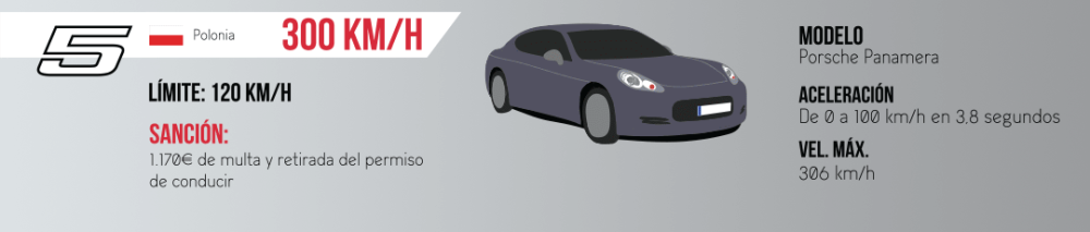Para el quinto puesto nos vamos directos a Polonia, donde un Porsche Panamera fue pillado a 300 km/h en una zona limitada a 120 km/h. La retirada del carné de conducir y una sanción económica de 1.170 euros fue a lo que tuvo que enfrentarse el conductor.