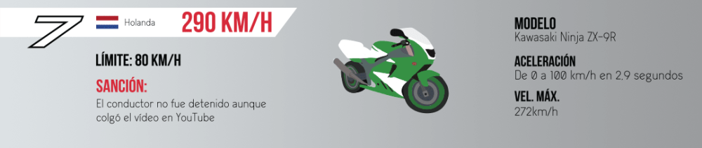 En esta lista también entra una motocicleta, concretamente una Kawasaki Ninja ZX-9R que fue pillada en Holanda mientras circulaba a 290 km/h en un tramo limitado a 60 km/h. Aunque no fue pillado en el momento, el conductor colgó el vídeo en YouTube y las autoridades consiguieron identificarlo.