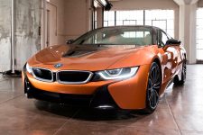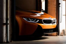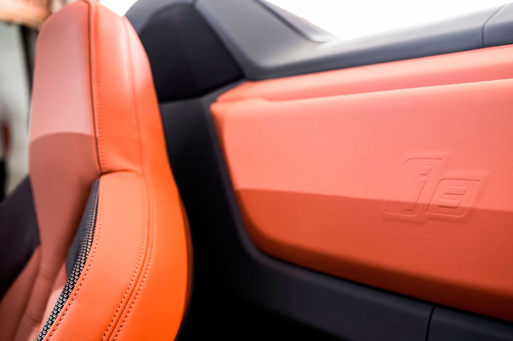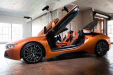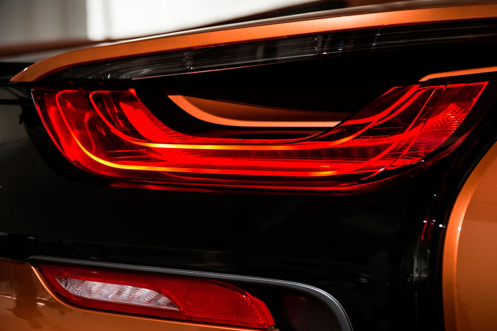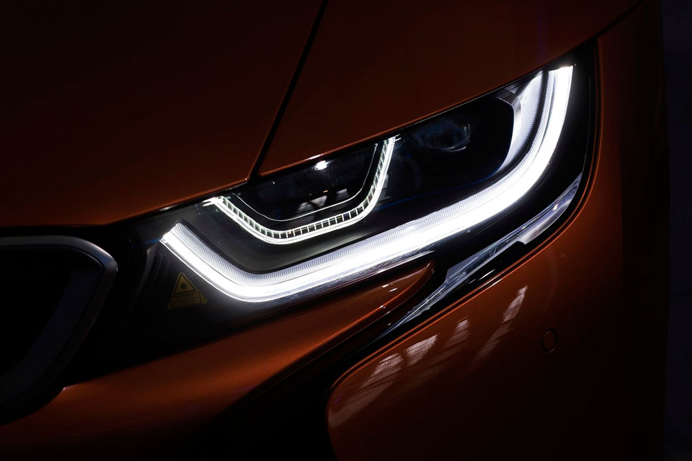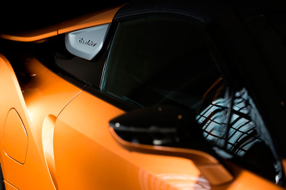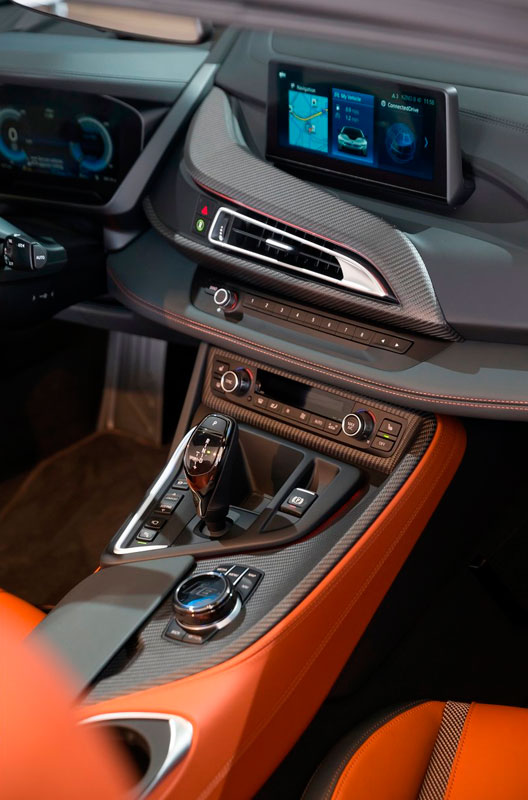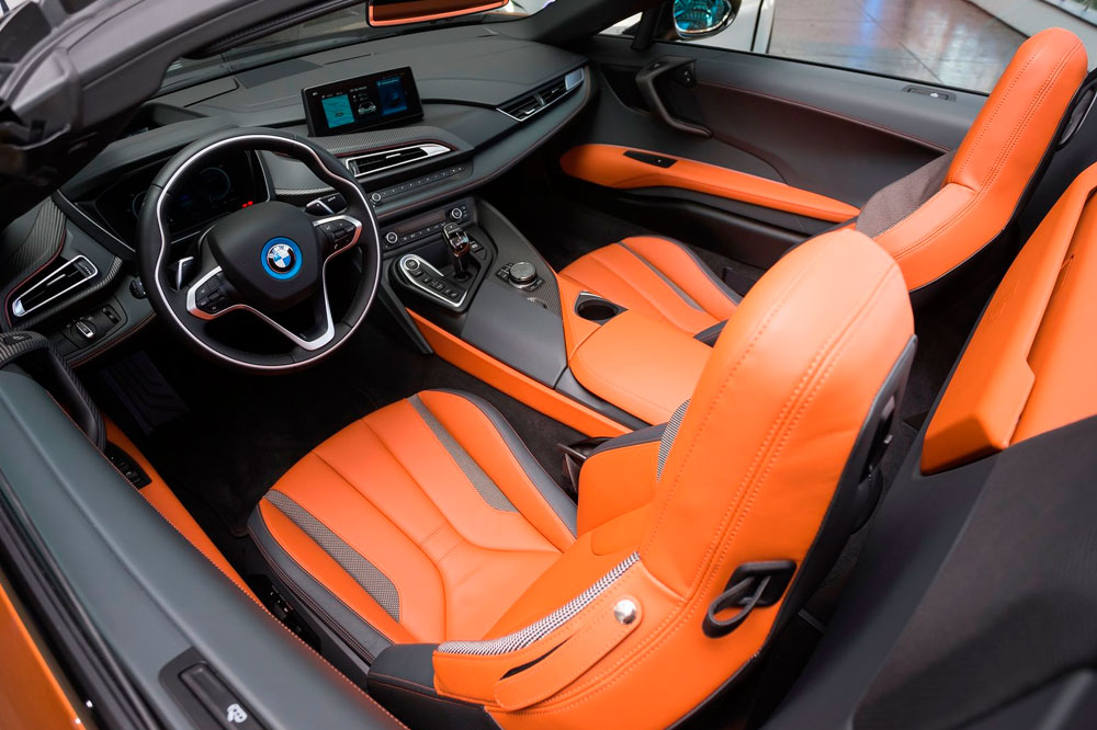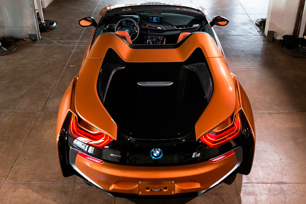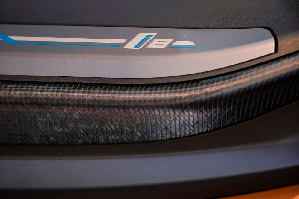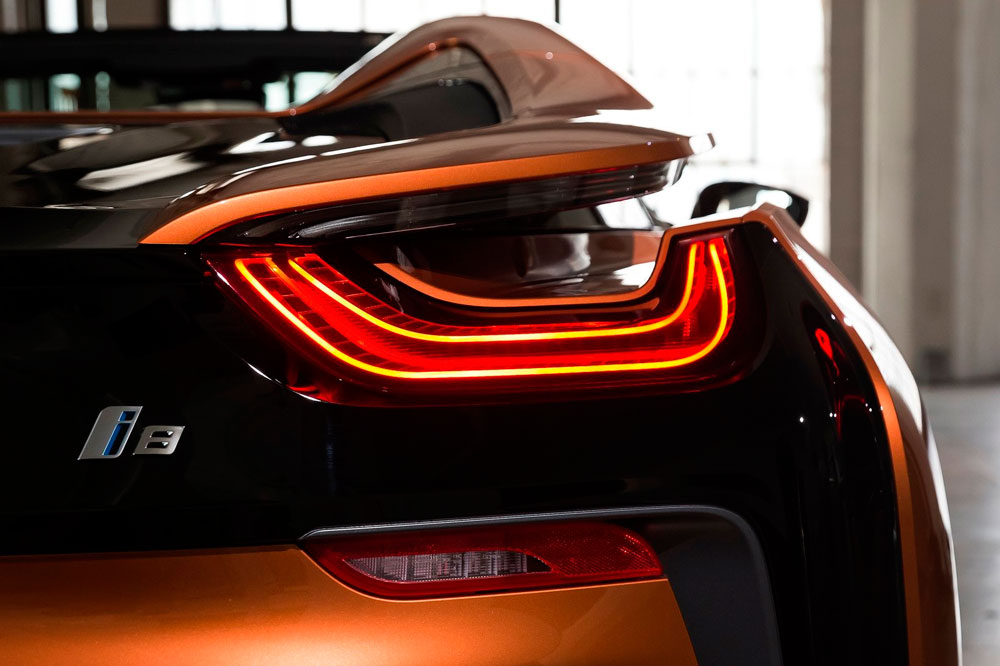 Descapotado, abrimos sus puertas, momento en el que una imagen con el anagrama i8 se proyecta en el suelo. A pesar de no tener marco, mantienen su apertura tipo ala de gaviota, uno de los puntazos de este deportivo híbrido. El frontal adopta la misma imagen; no así el capó, que equipa una nueva salida de aire cuya misión es enfriar las baterías, los radiadores y el propulsor. Debajo de él se halla otra novedad, aunque en este caso imperceptible, puesto que está oculta: el motor eléctrico de 143 CV -en la versión cerrada de la primera generación rendía 131 CV- que proviene del BMW i3 (prueba).