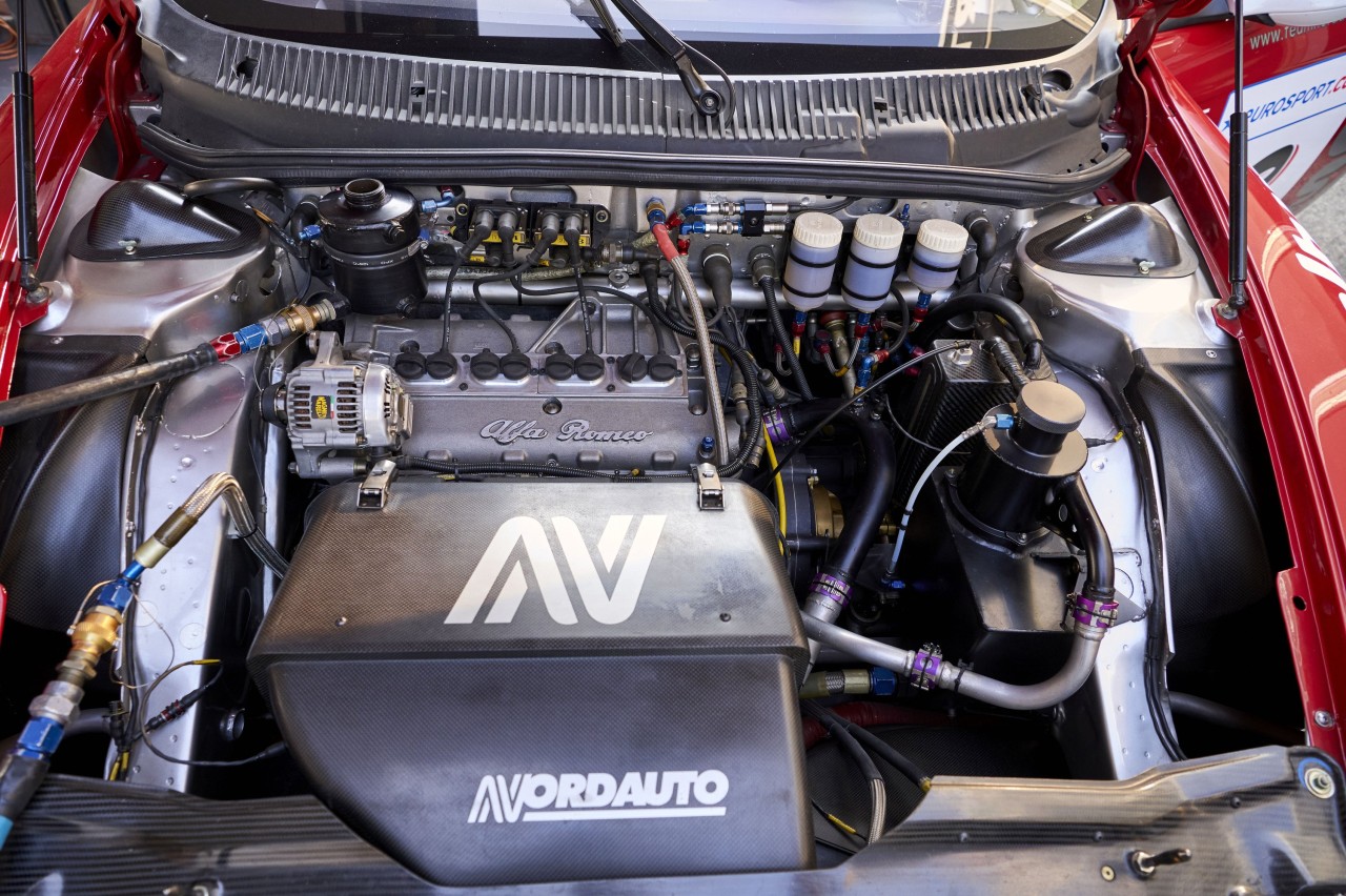 La berlina de Alfa Romeo monta el motor Twin Spark que utilizaba para las competiciones de Superturismo, colocado más abajo y más cerca del habitáculo para mejorar la distribución del peso. Entrega 310 CV y se combina con un cambio secuencial de seis relaciones, unido a un diferencial de deslizamiento limitado. Esta mecánica le permitió dominar el campeonato en Italia y Europa, consiguiendo los títulos de pilotos y marcas.
