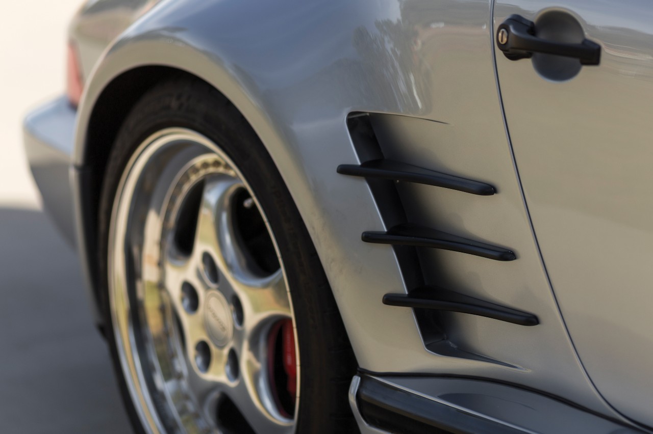 Lo que más llama la atención es su diseño, principalmente por el frontal, que luce el característico diseño ‘slant nose’ inspirado en el 930, peor también porque todos los ejemplares lucían una carrocería de color plateado y las llantas Speedline Cup de 18 pulgadas. Había dos opciones de alerón, uno más comedido, como el que tiene esta unidad y que montaron seis de las producidas, y otro más grande y llamativo para las cuatro restantes.