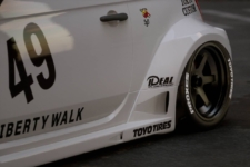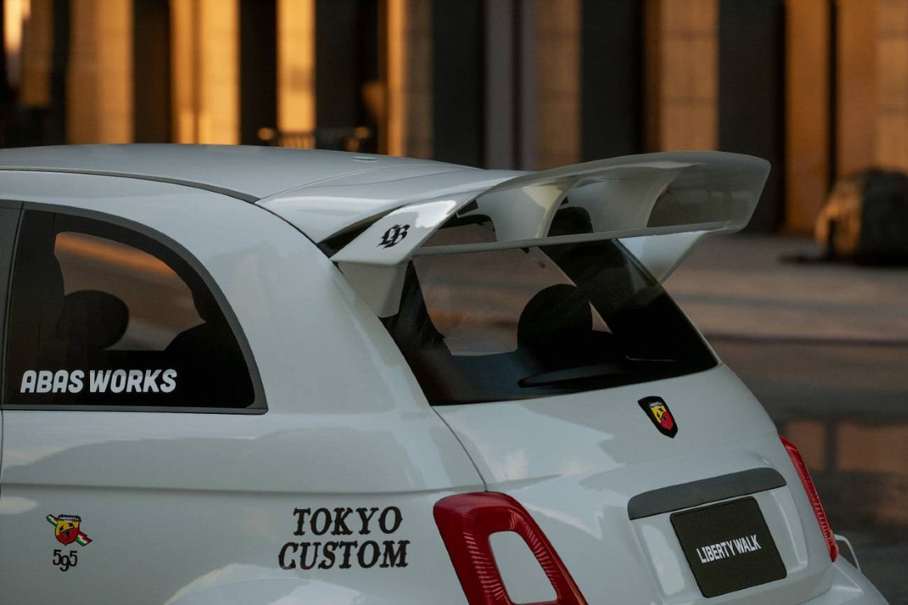En el frontal, Liberty Walk ha añadido un nuevo paragolpes con un splitter y canards aerodinámicos, unos pasos de rueda mucho más anchos para dotarlo al utilitario italiano de un aspecto más agresivo, especialmente, los traseros, unos faldones laterales alargados y unas llantas negras con neumáticos Toyo. La zaga es, quizá, la parte más exagerada, con un enorme alerón de techo inspirado en el WRC, un nuevo paragolpes muy prominente y un gran difusor con nuevos tubos de escape con salida central.