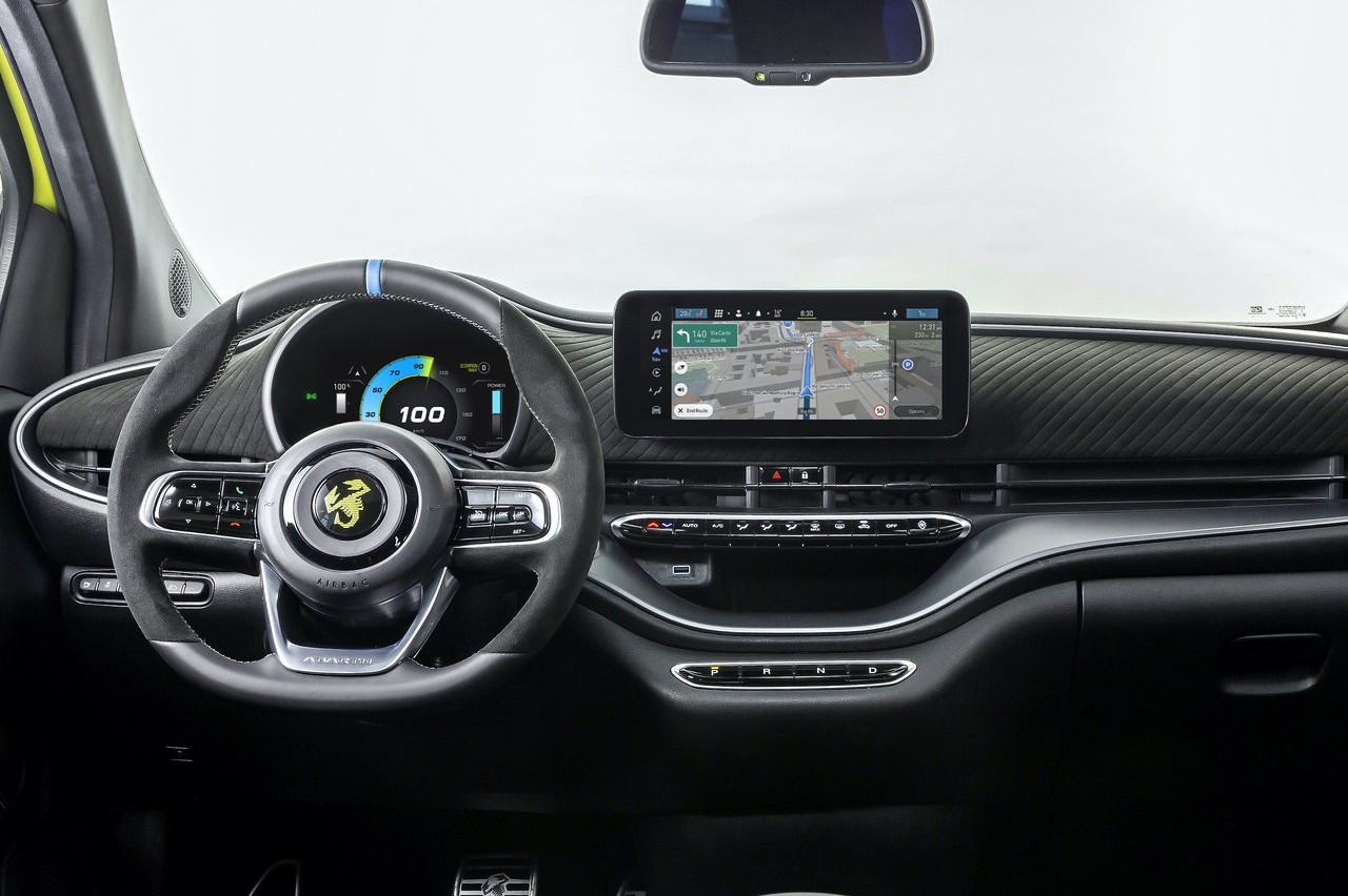 Pasamos al interior, donde encontramos la atmósfera típica de Abarth, en la que se respira un ambiente muy deportivo. Puede que estemos ante un Abarth eléctrico, pero conserva la esencia de los modelos del pasado, como puede comprobarse en varios detalles, desde el ambiente oscuro de los pilares y el forro de techo hasta la nueva cinta azul Poison de plegado del asiento delantero.