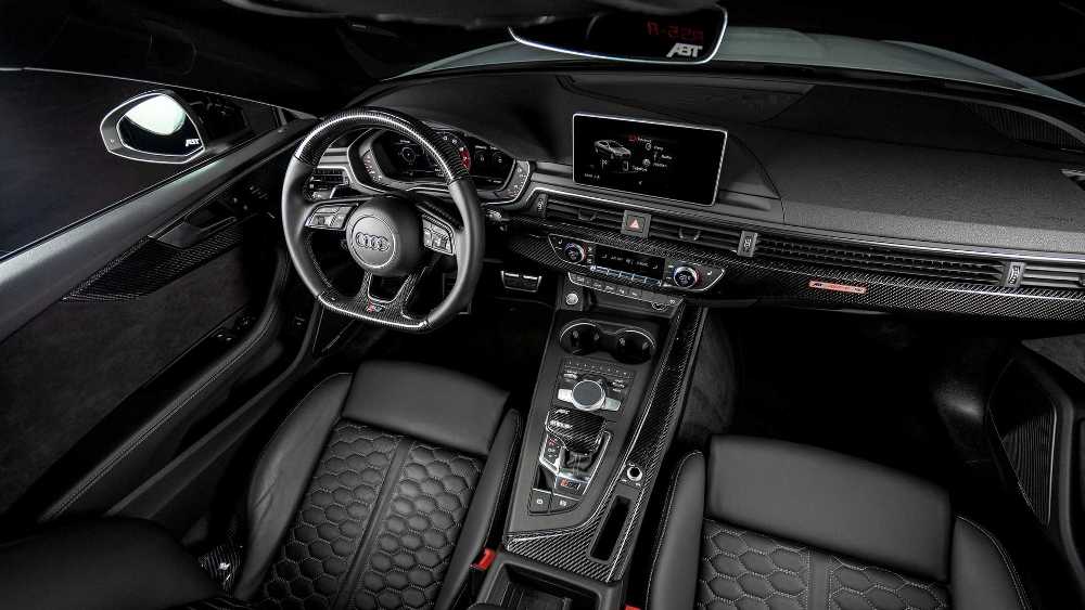 En el interior, los compradores pueden encontrar más fibra de carbono, en la cubierta de la palanca de cambios, los umbrales de las puertas e incluso en la estructura posterior e inferior de los asientos delanteros. ABT también ofrece fibra de carbono en el volante, el salpicadero y la consola central, así como en los paneles de las puertas y un sistema de proyección de luz que refleja el logotipo RS5-R en el suelo al abrir las puertas.