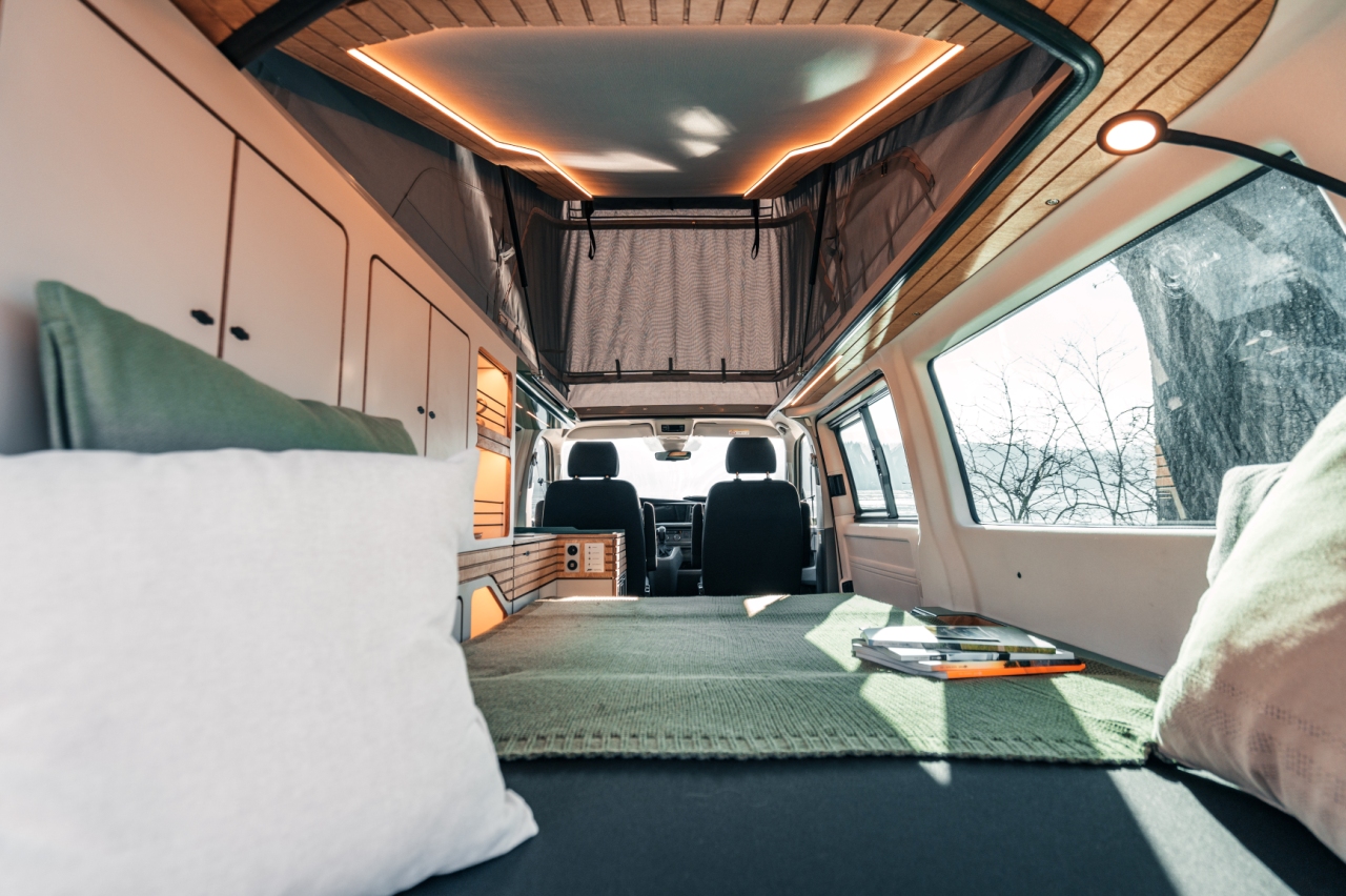 La XNH, que tiene 40 centímetros más de distancia entre ejes que el T6.1 estándar, equipa cinco asientos en una amplia cocina con placa de inducción doble, nevera y mesa. Además, hay una cocina extraíble al aire libre con fogones de gas en la parte trasera. También cuenta con placas solares y una batería de iones de litio como unidad de almacenaje de energía para el suministro eléctrico de su equipamiento y la iluminación.