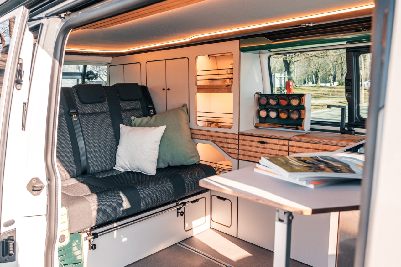 Sin embargo, la parte principal de este proyecto es su conversión a camper van. De este modo, el interior de la ABT XNH ha sido diseñado por la empresa VANING GmbH, con mobiliario hecho a medida en un material resistente a los arañazos y con fácil mantenimiento. El montaje de todos los componentes, incluyendo el revestimiento de las paredes, lo lleva a cabo Volkswagen Group Services, el especialista en la construcción de vehículos especiales.