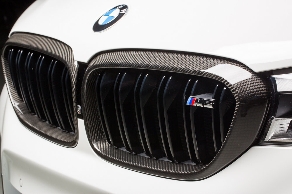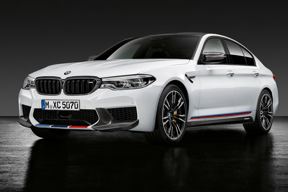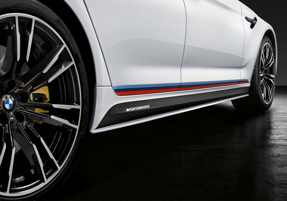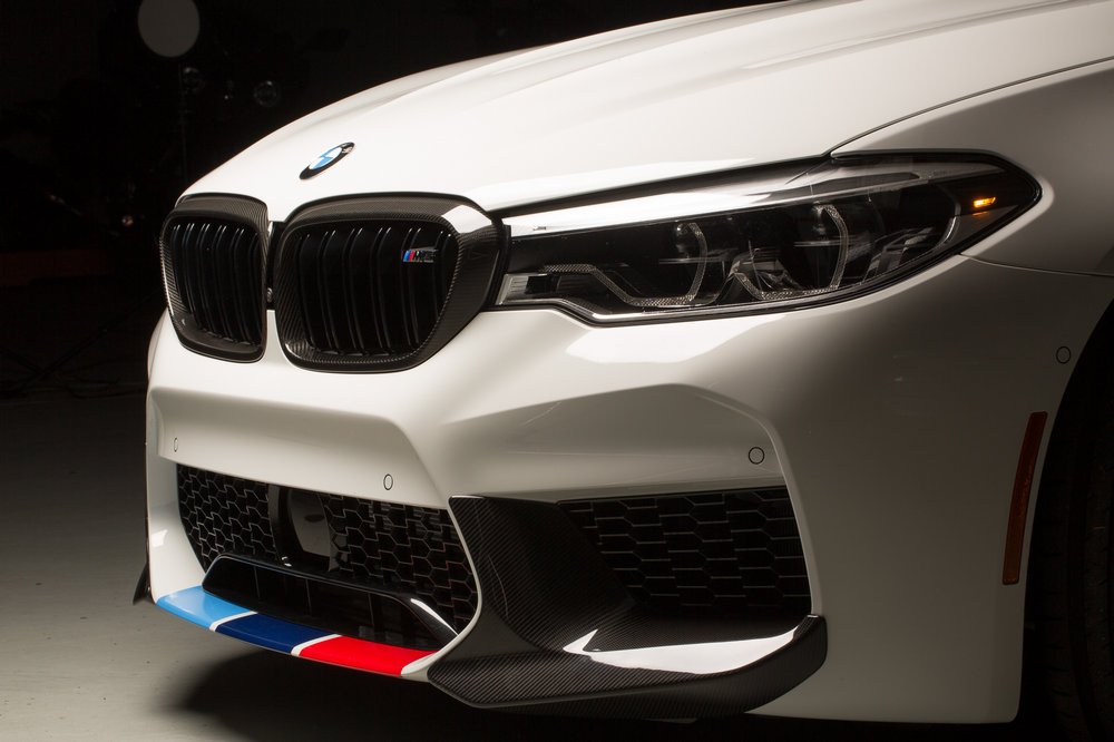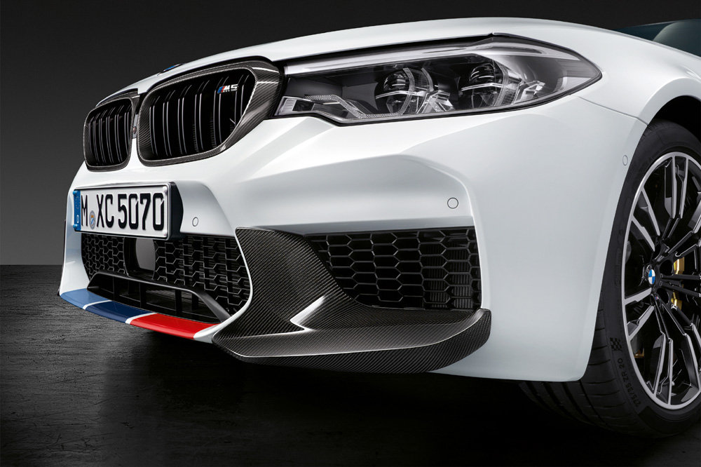 Los accesorios del nuevo BMW M5 estará disponibles a partir de la próxima primavera y no solo hacen que el sedán luzca una imagen más agresiva, también consiguen mejorar su rendimiento dinámico al optimizar la aerodinámica. Hay un nuevo faldón delantero, taloneras, un alerón trasero o un difusor posterior, elementos que están realizados con fibra de carbono, al igual que las carcasas de los retrovisores o la parrilla delantera.