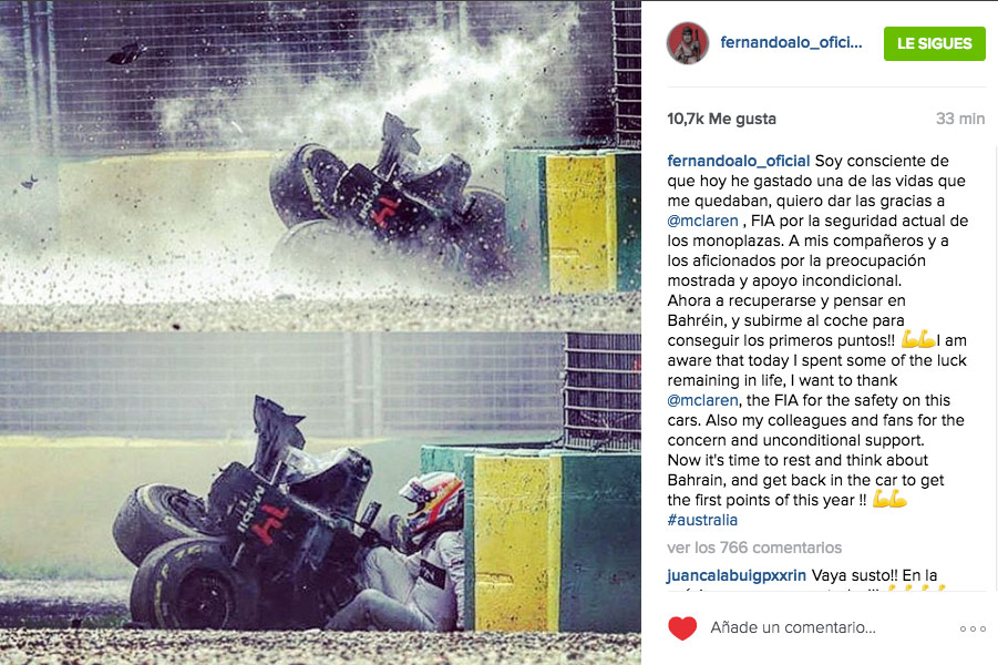 Tras el accidente, Fernando Alonso ha subido a su cuenta de Instagram una imagen del siniestro con el siguiente mensaje: “Soy consciente de que hoy he gastado una de las vidas que me quedaban. Quiero dar las gracias a McLaren, a la FIA por la seguridad actual de los monoplazas, a mis compañeros y a los aficionados por la preocupación mostrada y por el apoyo incondicional. Ahora a recuperarse y pensar en Bahréin, y subirme al coche para conseguir los primeros puntos!!”.