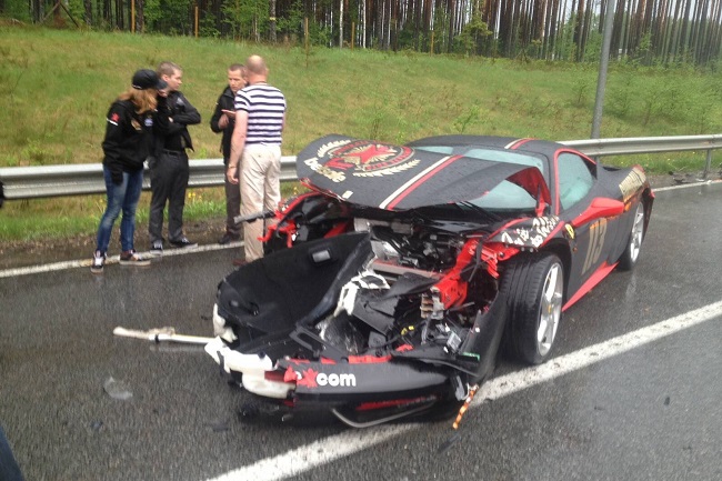 El Ferrari 458 Italia accidentado en el Gumball 3000 participaba con el equipo Betsafe Team 113 y según afirman desde GTSpirit, circulaba a velocidades legales en el momento del incidente. Al parecer, las fuertes lluvias habían provocado la aparición de charcos de agua sobre la calzada y al pasar sobre uno de ellos, acabó estrellándose.