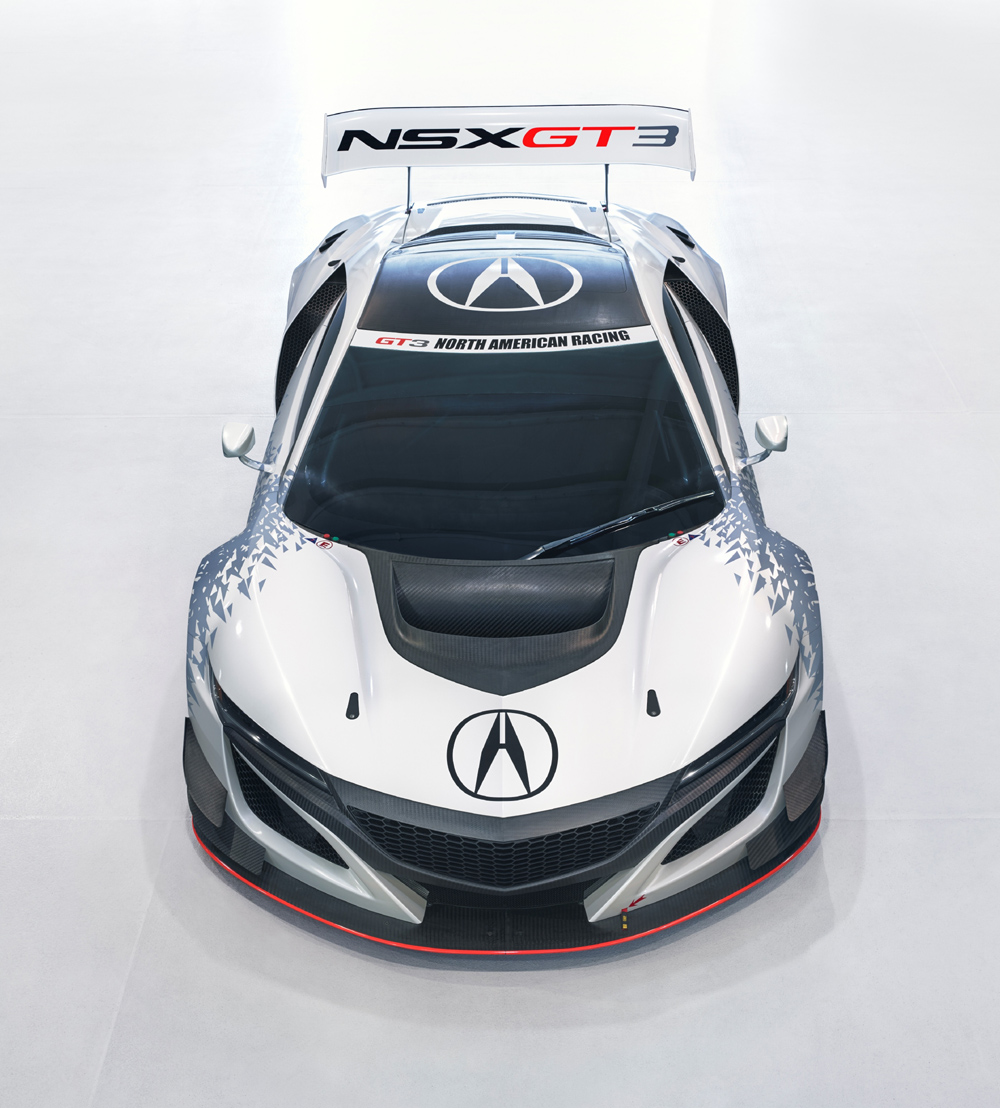 Hay cambios que se aprecian a simple vista, como los introducidos en la carrocería del NSX GT3, que además, para la ocasión deja a la vista su estructura de fibra de carbono. Las modificaciones aerodinámicas incluyen un agresivo paragolpes delantero, un colosal alerón trasero fijo, un gran difusor o unas salidas de aire más grandes sobre el capó. Para garantizar un funcionamiento óptimo incluso en los circuitos más calurosos de Norte América (lugar donde, en principio, competirá en exclusiva), dispone también de un sistema de refrigeración optimizado.
