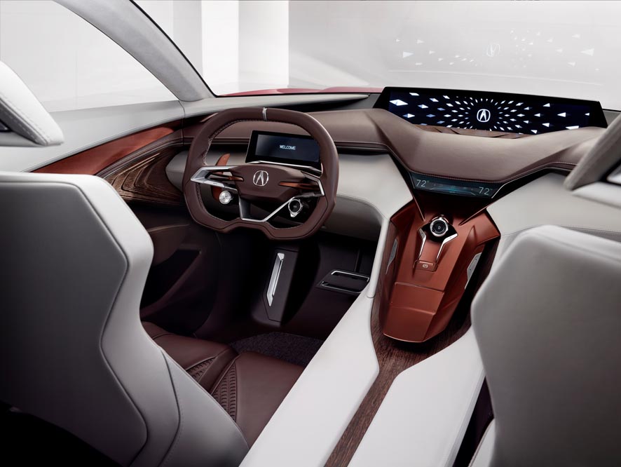 El interior, como concept que se precie, es futurista. Despunta por la reducción de botones y por la gran pantalla instalada en el salpicadero, además de la que sirve como cuadro de instrumentos, bastante más pequeña. Se han combinado materiales de primera como el cuero, la Alcantara o la “madera exótica” de la rejilla de los altavoces del sistema de sonido. Asimismo, el diseño de la consola central flotante, lo asientos traseros “ultrafinos”, también flotantes, y la ausencia de pilar b son características que Acura ha querido resaltar en su comunicado de prensa.
