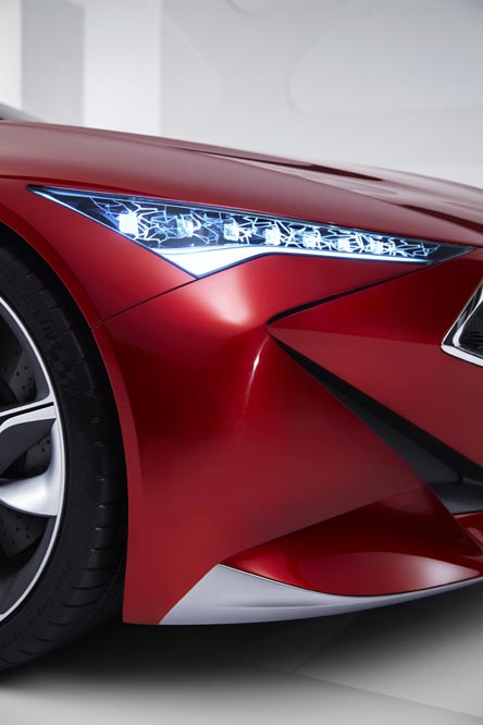 Su estampa con multitud de vértices y líneas muy esculpidas, impone. Es realmente bajo, ancho y tiene una amplia batalla, con lo que sus voladizos, que escoltan llantas de 22 pulgadas, son bastante cortos. Se nota la influencia del Honda NSX 2015, sobre todo en su parte frontal, y es que la jefa de diseño de este Acura Precision Concept es la misma que la encargada de la segunda generación de mítico deportivo de la compañía. Destaca su parrilla pentagonal compuesta de diamantes y el planteamiento de los grupos ópticos, los delanteros con el sistema denominado ‘Jewel Constellation LED’ y los traseros con LED flotantes.