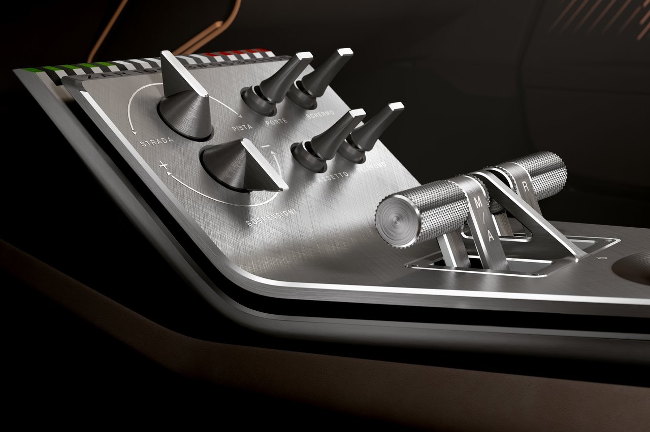 El interior también tiene el carácter retro del exterior, diseñado con el propósito de reducir al mínimo los componentes que pudieran distraer al conductor, como se aprecia en el número limitado de botones, ubicados todos en la consola central. Justo delante del conductor hay una pantalla con un diseño ‘telescópico’ en 3D. Los mandos están situados a distintos niveles, en la parte baja de la consola central y en un plano superior, instalados en el revestimiento central del interior del techo. El volante también ha sido desprovisto de botonería para ofrecer la experiencia de conducción más pura posible.
