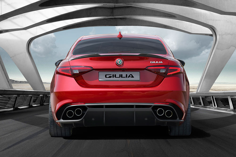 La novedosa berlina de tracción trasera o total exhibe un diseño renovado y muy acertado que se caracteriza por sus cortos voladizos, musculosos pasos de rueda, capó de longitud considerable y una generosa batalla gracias a la cual, según la compañía italiana, puede presumir de tener la más amplia de la categoría. Asimismo, tanto el frontal como la zaga son redondeados y los montantes, envolventes, con lo que recuerda al elogiado Giulietta Sprint.