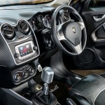 Pero lo más logrado o por lo menos, lo que más nos ha llamado la atención, está en el habitáculo. El Alfa Romeo Mito by Marshall dispone de una tapicería que imita a la perfección el diseño de los amplificadores y otros muchos detalles, como la llamativa palanca de cambios, las alfombrillas, o la placa identificativa ubicada en el umbral de las puertas. Como no podía ser de otra forma, en el maletero encontramos dos altavoces y un amplificador Marshall.
