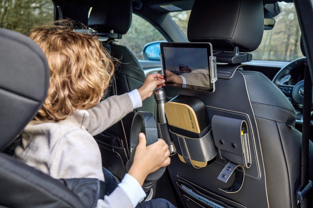 En el centro de la banqueta posterior, hay un cofre de seis litros de capacidad donde se pueden guardar algunos juguetes, mientras que en los respaldos de los asientos delanteros hay dos organizadores para alojar objetos como botellas de agua, estuches o revistas. También hay un soporte para tablets en los reposacabezas para mantener entretenidos a los niños durante un viaje, así como una cámara para vigilar a los niños directamente desde el móvil.