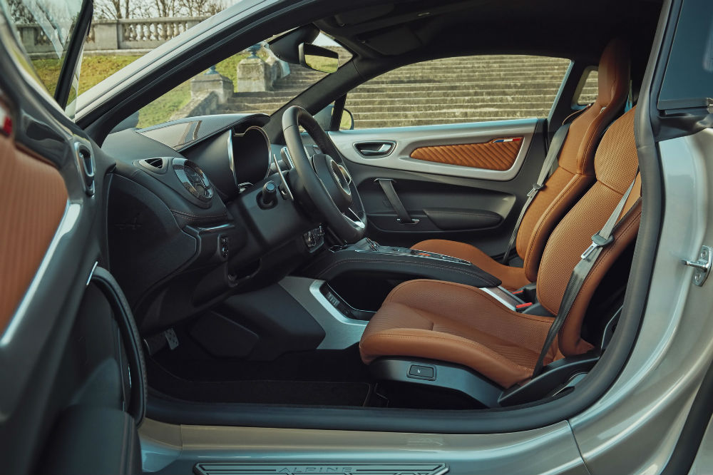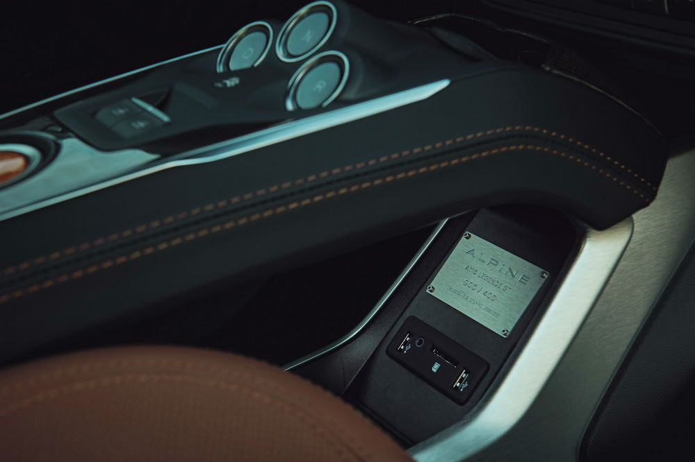 Para el interior Alpine ha desarrollado un nuevo tono de marrón para la piel que forra tanto los paneles de las puertas como para los asientos, unos Sabelt ajustables en seis posiciones, y para el juego de maletas de tres piezas hecho a medida para el deportivo. A esto se suman varios apliques e insertos en fibra de carbono brillante, la placa con el número de la unidad bajo el túnel central y un volante que luce una marca en la parte central superior.