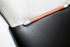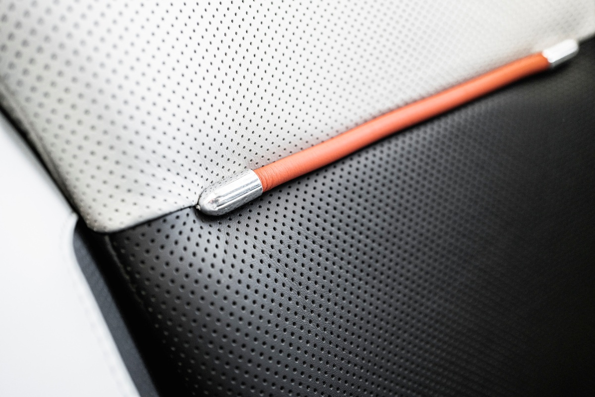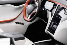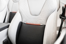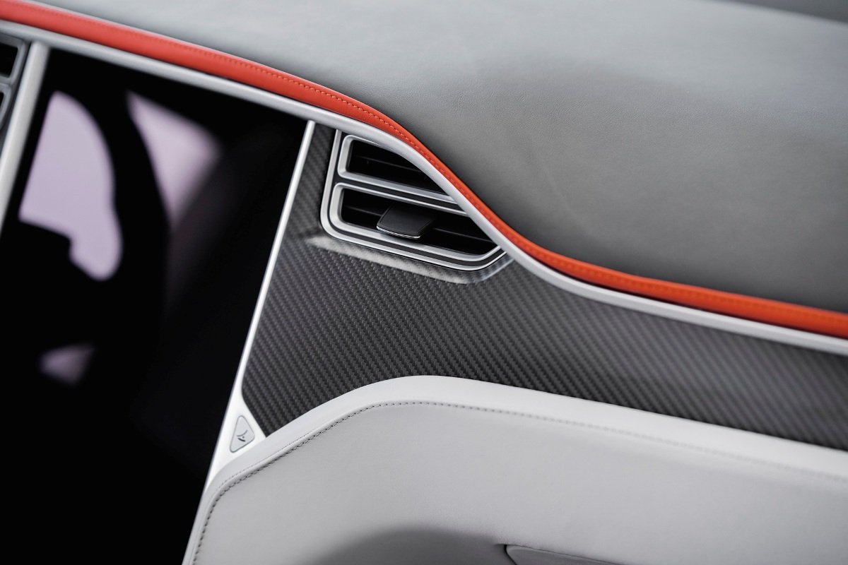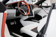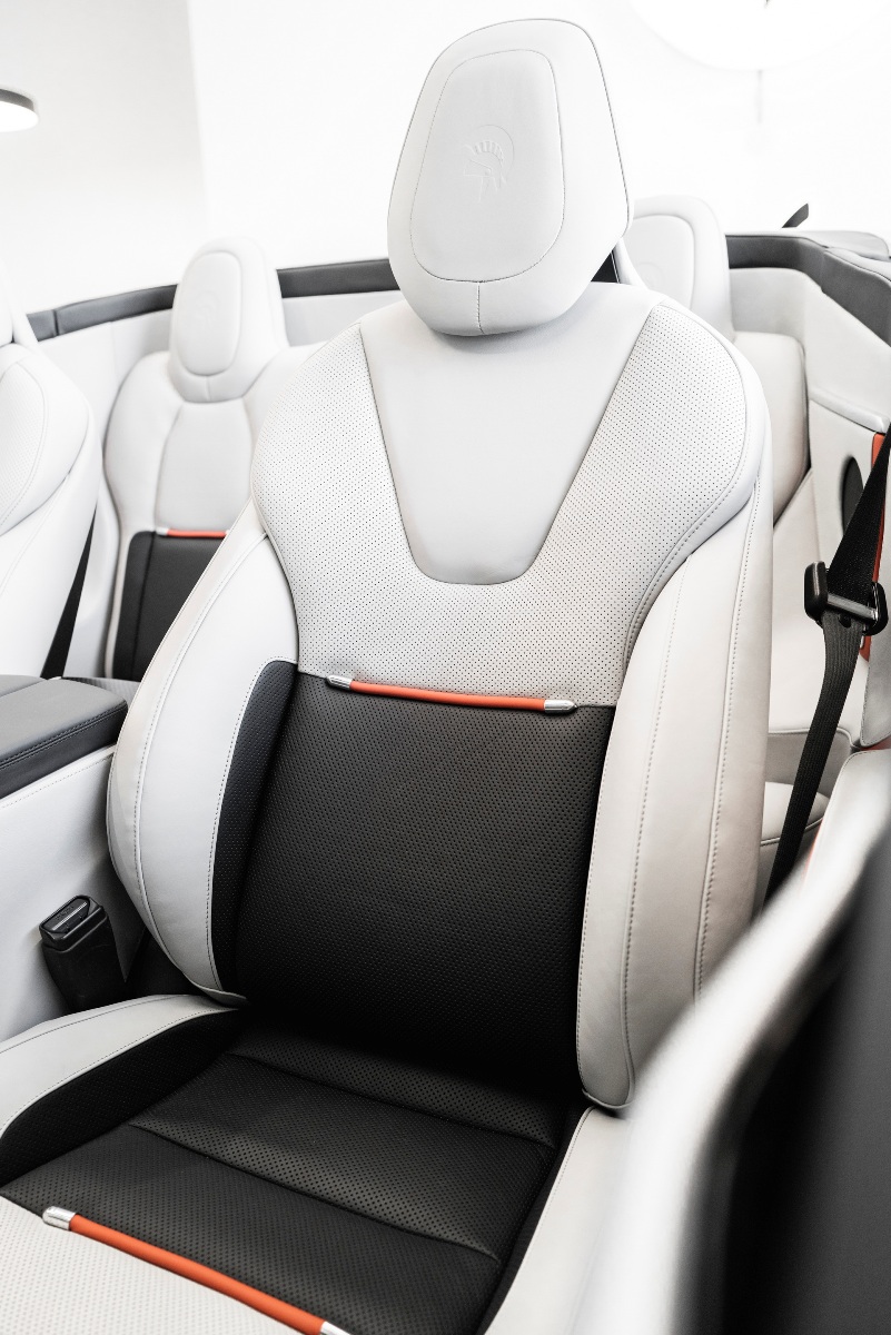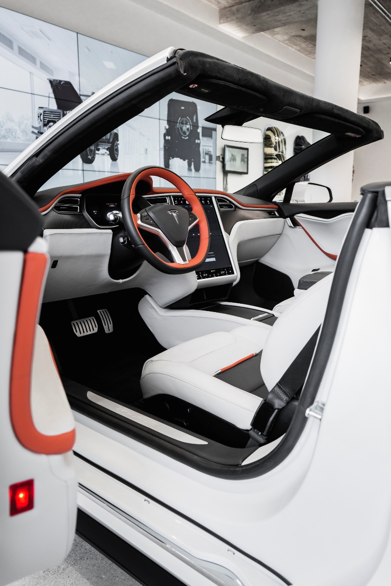 Dentro del Tesla Model S descapotable de Ares Design, el preparador eliminó los asientos traseros originales e instaló unos nuevos hechos a medida con tan solo dos plazas. Naturalmente, sus especialistas en tapicería los cubrieron con “el mejor cuero blanco hielo cosido a mano con detalles naranjas”. Estos mismos detalles están presentes en el salpicadero, los paneles de las puertas y la sección interior del volante.