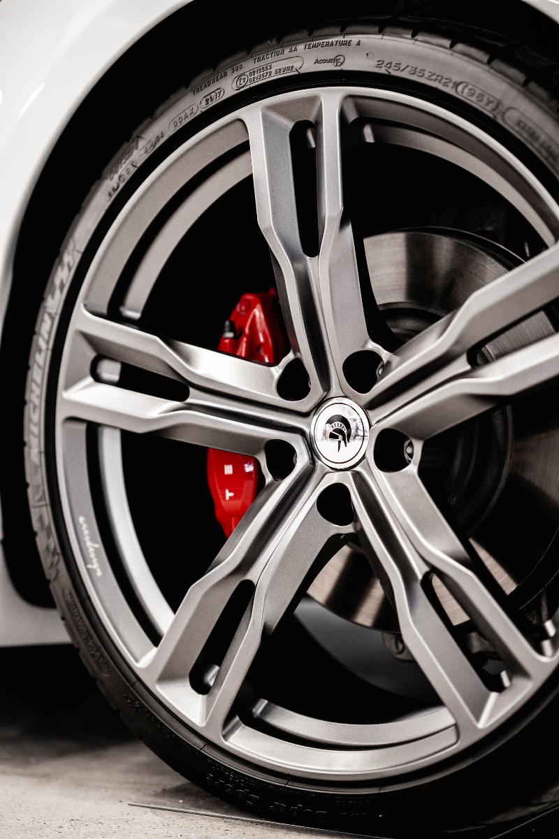 Los ingenieros han reforzado el chasis debajo de la cabina y el área de los asientos traseros. Una nueva cubierta ocupa gran también parte del espacio dedicado originalmente a las plazas traseras y, bajo ésta, se esconde el techo de lona retráctil. También se ha incluido un kit aerodinámico de fibra de carbono, como muestran los nuevos parachoques y taloneras. Las nuevas llantas de aleación de 21 pulgadas en diseño de cinco radios dobles completan el conjunto exterior. Y, aunque este coche no las lleva instaladas, cualquier otro encargo que reciba el preparador contará con un sistema de protección antivuelco completo.