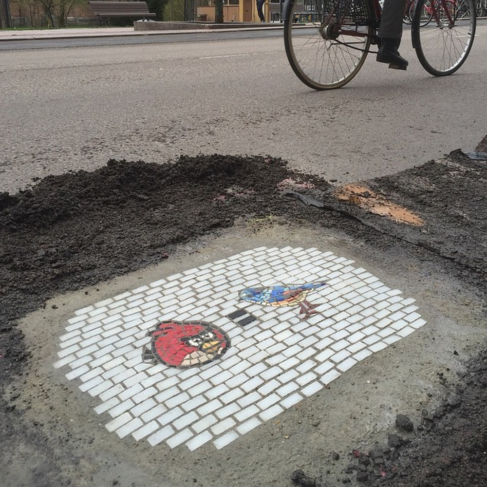 ¿Un ejemplo? Jim ha decidido colocar en alguno de ellos el número de teléfono del taller de reparación de automóviles más próximo, para que los conductores que sufran una avería como consecuencia de los agujeros del asfalto puedan ponerse en contacto con el centro más cercano. Obviamente, estos mosaicos son simplemente reparaciones temporales, de hecho, alguna de sus obras ya ha sido sustituida por hormigón, pero hay que reconocer que tiene mucho mérito, sobre todo si tenemos en cuenta que cada uno de esos baches que repara le cuesta 50 dólares de su propio bolsillo y eso sin contar la cantidad de horas que dedica para el diseño y posterior colocación.