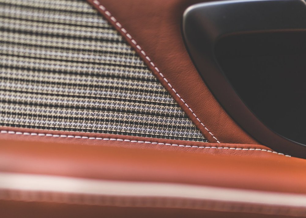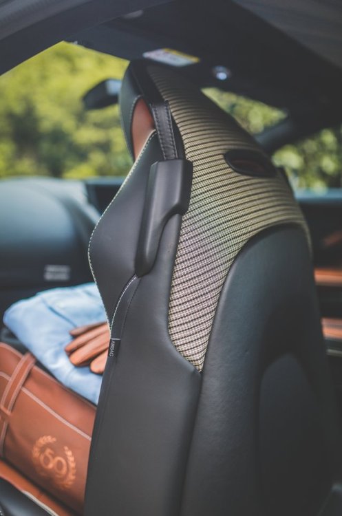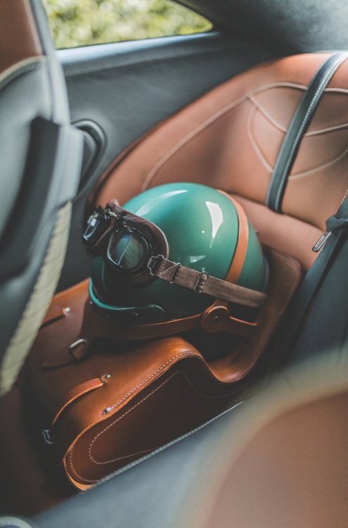 El material original del asiento del DBR1 de competición fue analizado y recreado especialmente para el Aston Martin DBS 59. El interior combina cuero Obsidian Black y Chestnut Tan, borados especiales en el parasol, palanca de cambios en bronce y un logotipo ’59 Edition’ en el respaldo de los asientos. También se ofrecerán réplicas de cascos originales, los trajes de carreras azules y los guantes de Caroll Shelby.