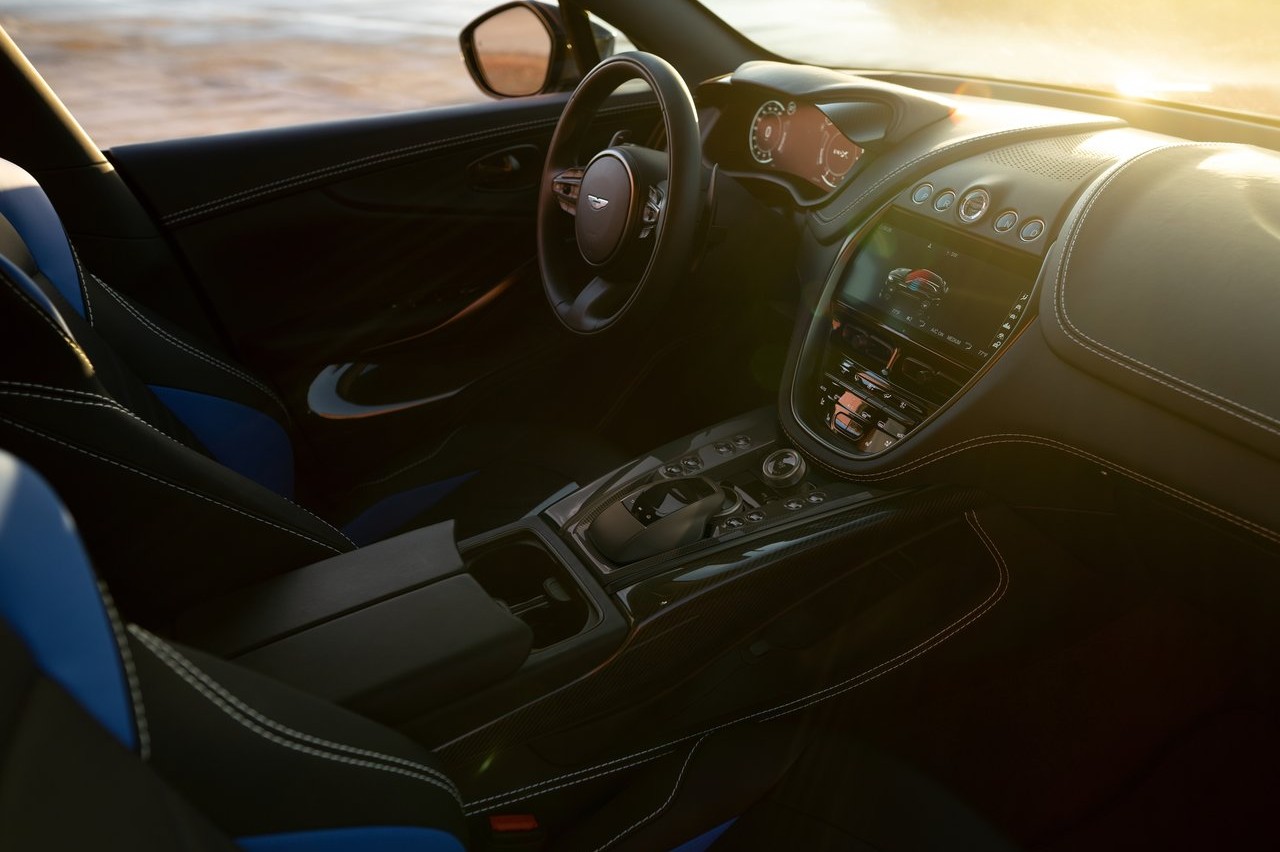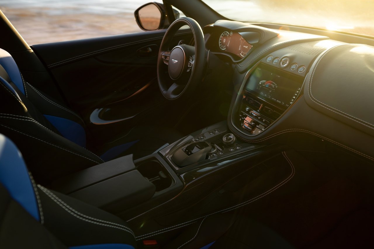 Encontramos también numerosas superficies en acabado cromado oscuro, que combinan perfectamente con el exterior, así como zonas con fibra de carbono y piano black, como opción. Para quienes quieran aún más exclusividad, el servicio de personalización Q by Aston Martin, ofrece un gran abanico de posibilidades de adaptación a medida.