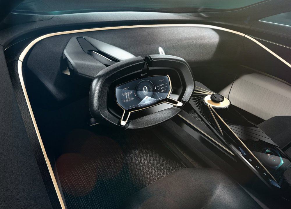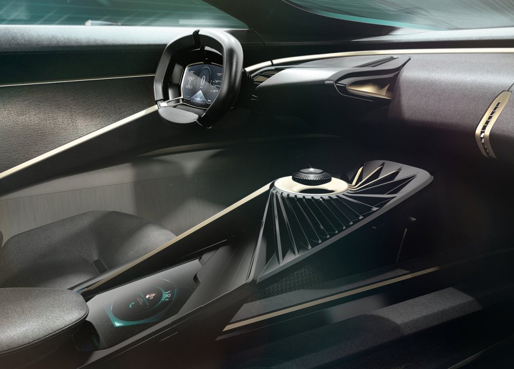 El nuevo concept car de Aston Martin presenta espacio en su interior para hasta cuatro pasajeros. En la parte delantera tenemos un cuadro de instrumentos digital integrado en el volante, otra pequeña pantalla justo al frente del apoyabrazos centra y un control giratorio para gestionarlo. Otro de estos mandos se encuentra en la parte posterior, entre los asientos individuales que se han situado muy atrás para ofrecer un amplio espacio para las piernas.