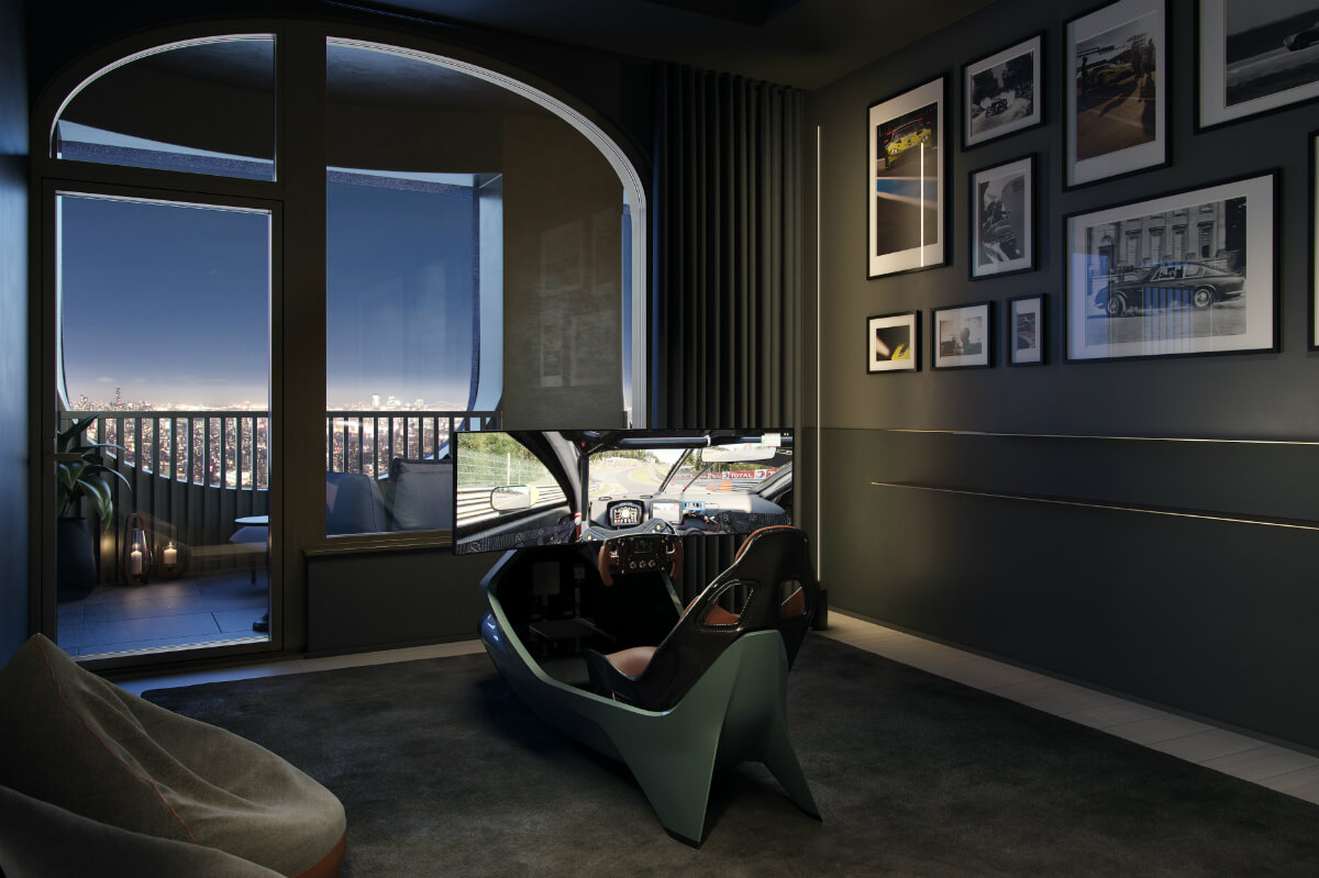 De la mano de Aston Martin, los compradores tendrán la opción de personalizar una de las habitaciones para convertirla en un simulador de carreras. Para ello, Aston Martin Design ha colaborado con la empresa británica de tecnología Curv Racing Simulators fundada por Darren Turner, tres veces ganador de las 24 Horas de Le Mans para Aston Martin. Juntos han creado lo último en simuladores de lujo para los hogares de los amantes del motor.
