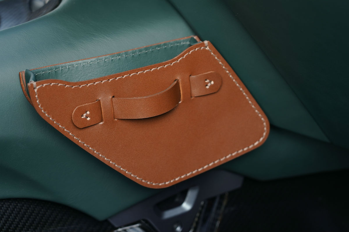 En el interior se combina la sensación de estar ante un deportivo de competición, gracias a detalles como la forma del volante o la disposición del cuadro de mandos y la consola central, con el lujo característico de la marca británica, representado por todos los elementos de cuero presentes, en un color marrón que contrasta con el tono verde predominante en el habitáculo.