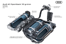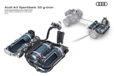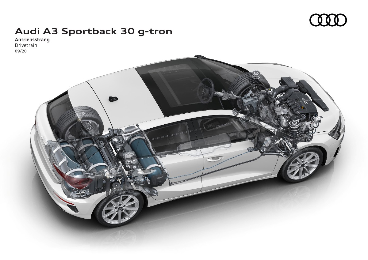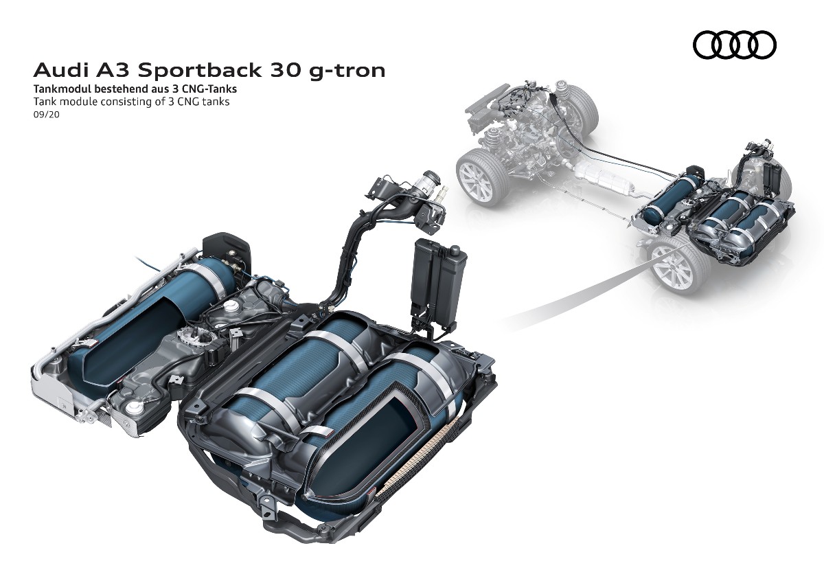 Para ello, los ingenieros de Audi han trabajado para adaptar la culata, el sistema de inyección, el turbocompresor y el convertidor catalítico, mientras que el GNC se almacena en tres depósitos dispuestos perpendicularmente, los cuales presentan una capacidad total de 18 kg de gas. Están fabricados en materiales compuestos de fibra de carbono y de vidrio, lo que le ayuda a contener su peso hasta los 26 kilogramos por depósito, mientras que ofrecen una alta resistencia. Además, los depósitos han sido testados para soportar una presión de hasta 580 bar, muy por encima de los 200 bar de presión a la que funcionan.