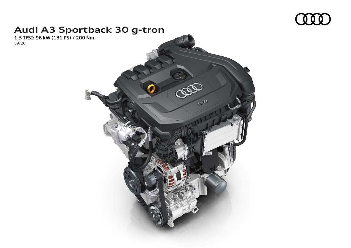 Disponible únicamente con carrocería Sportback de cinco puertas, el A3 g-tron 2020 equipa un motor 1.5 TFSI que ofrece 131 CV de potencia y 200 Nm de par motor máximo entre 1.400 y 4.000 rpm. Dispone de un turbocompresor de geometría variable con proceso de combustión Miller que ofrece diferentes ventajas en cuanto a consumo. Pero lo realmente importante en este coche es que puede utilizar tanto gasolina como GNC.
