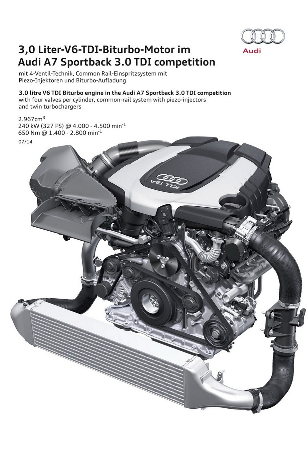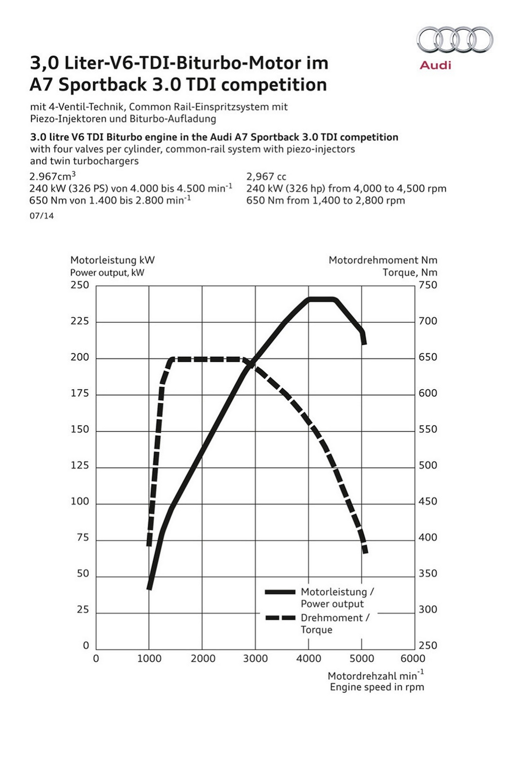 La principal novedad que incorpora el Audi A7 Sportback 3.0 TDI Competition no se ve a simple vista, nos referimos al motor V6 3.0 TDI biturbo, que ahora rinde 326 CV y 650 Nm de par motor gracias a las modificaciones efectuadas en los árboles de levas. Además, en momentos puntuales, cuando el conductor acelere a fondo, el propulsor puede entregar 20 CV adicionales durante un breve periodo de tiempo, lo que eleva la potencia total a 346 CV.