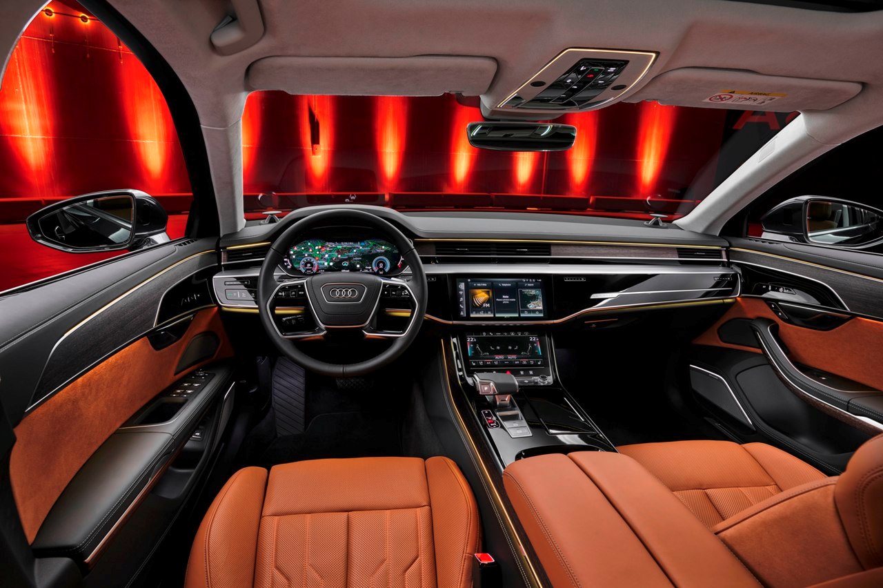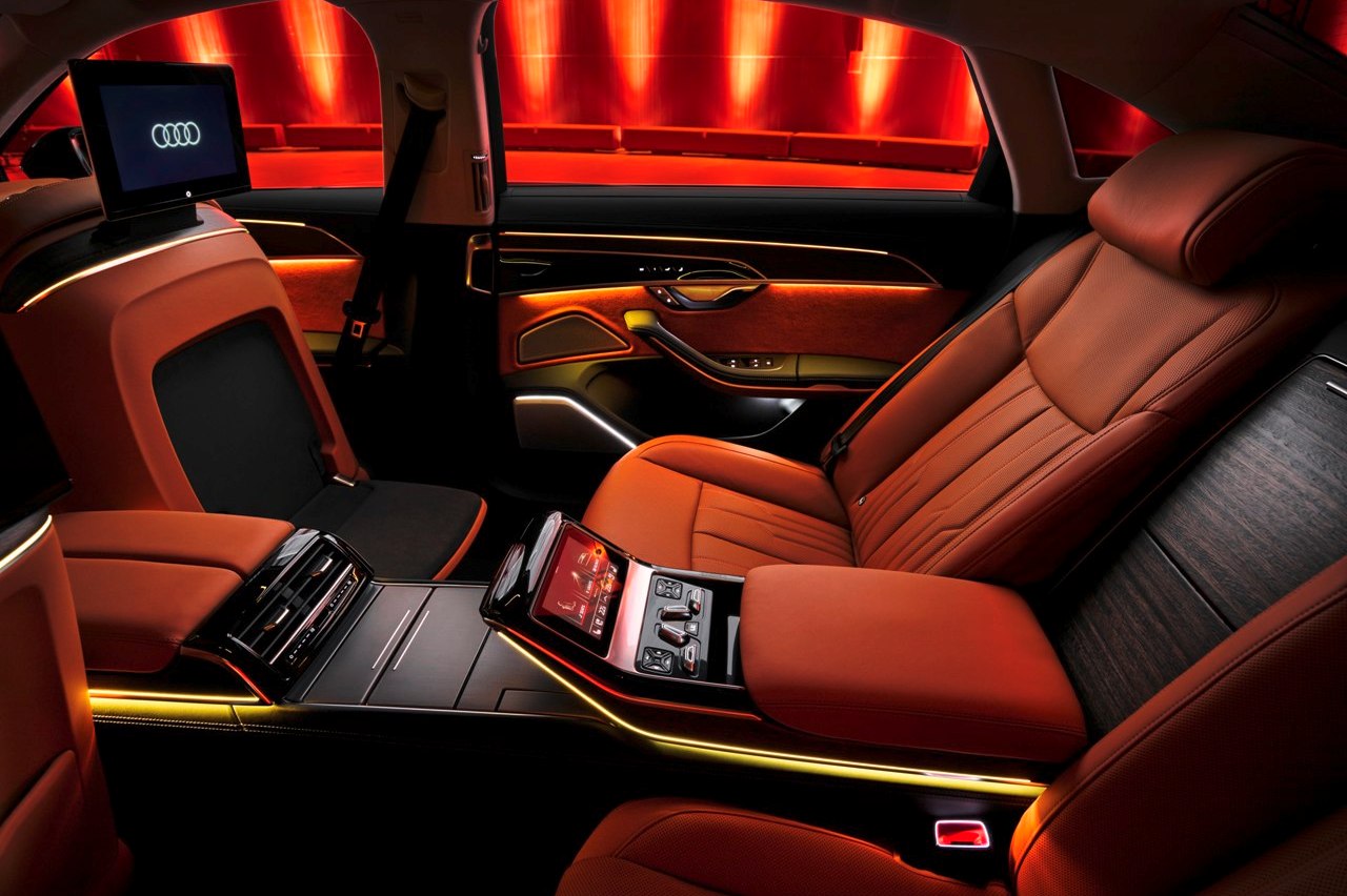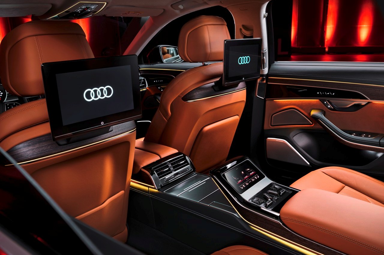 Además, el paquete de asientos relajación cuenta con una función de masaje para la espalda con 18 cojines neumáticos, reposacabezas de confort ajustable eléctrico, consola central con una mesa plegable opcional, aire acondicionado de cuatro zonas y las nuevas pantallas traseras de 10,1 pulgadas y resolución Full HD. Los asientos están tapizados en cuero Valetta de serie y, como novedad en el A8 2022, se ofrece el material de microfibra sostenible Dinamica para la cabina.