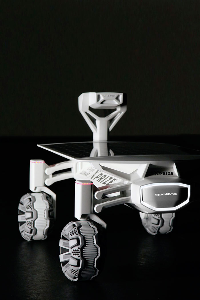 La compañía de Ingolstadt se ha unido a un grupo de ingenieros alemanes denominado ‘Part-Time Scientists’ para crear el Audi lunar quattro. Este vehículo, que ha sido creado tomando como base el Google Lunar XPRIZE, tiene la misión de explorar la Luna. Está realizado principalmente en aluminio y cuenta con una batería de iones de litio, así como un panel solar.