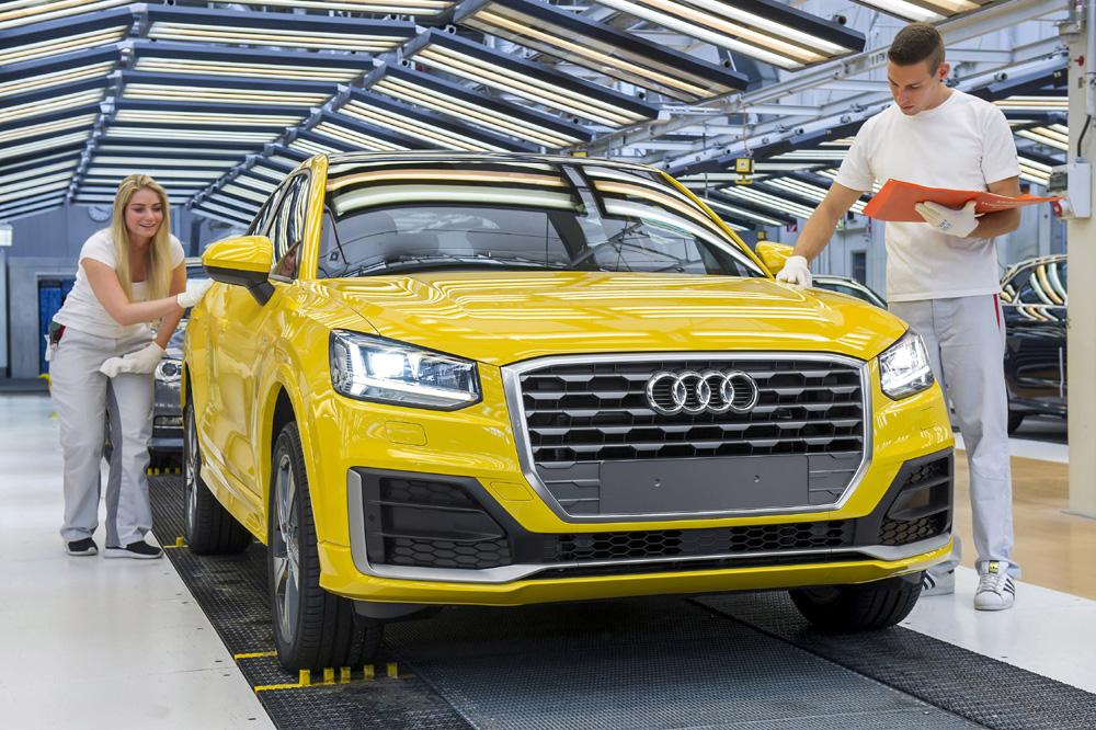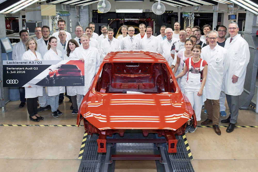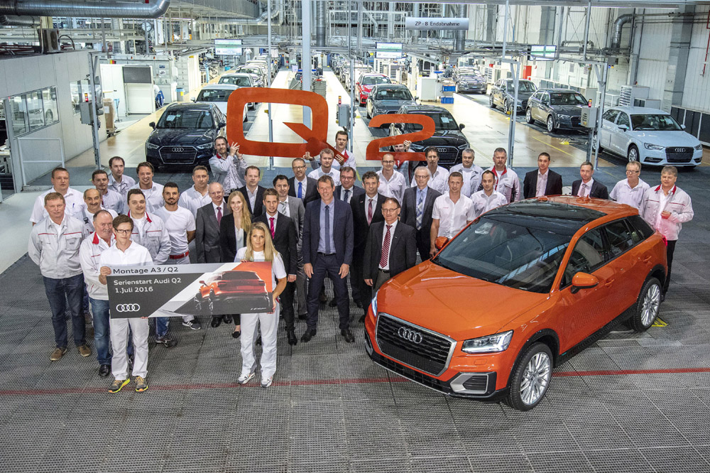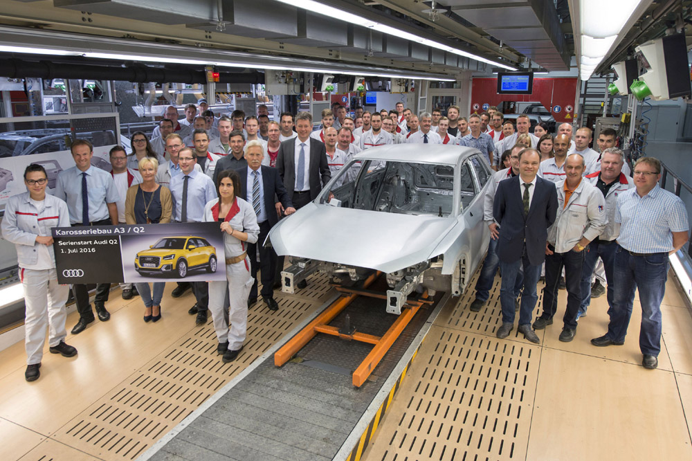 El nuevo Audi Q2 comparte línea de montaje con el Audi A3 (prueba), empleando el mismo taller de carrocería y líneas de pintura y ensamblado. Para que esto sea así, la marca ha tenido que realizar importantes modificaciones en la factoría de Ingolstadt y readaptar la logística. La producción irá aumentando progresivamente hasta alcanzar las 450 unidades diarias. Recordemos que la marca fabrica más de medio millón de automóviles al año en Ingolstadt, con una cadencia de un coche cada 30 segundos, más de 2.500 coches al día.