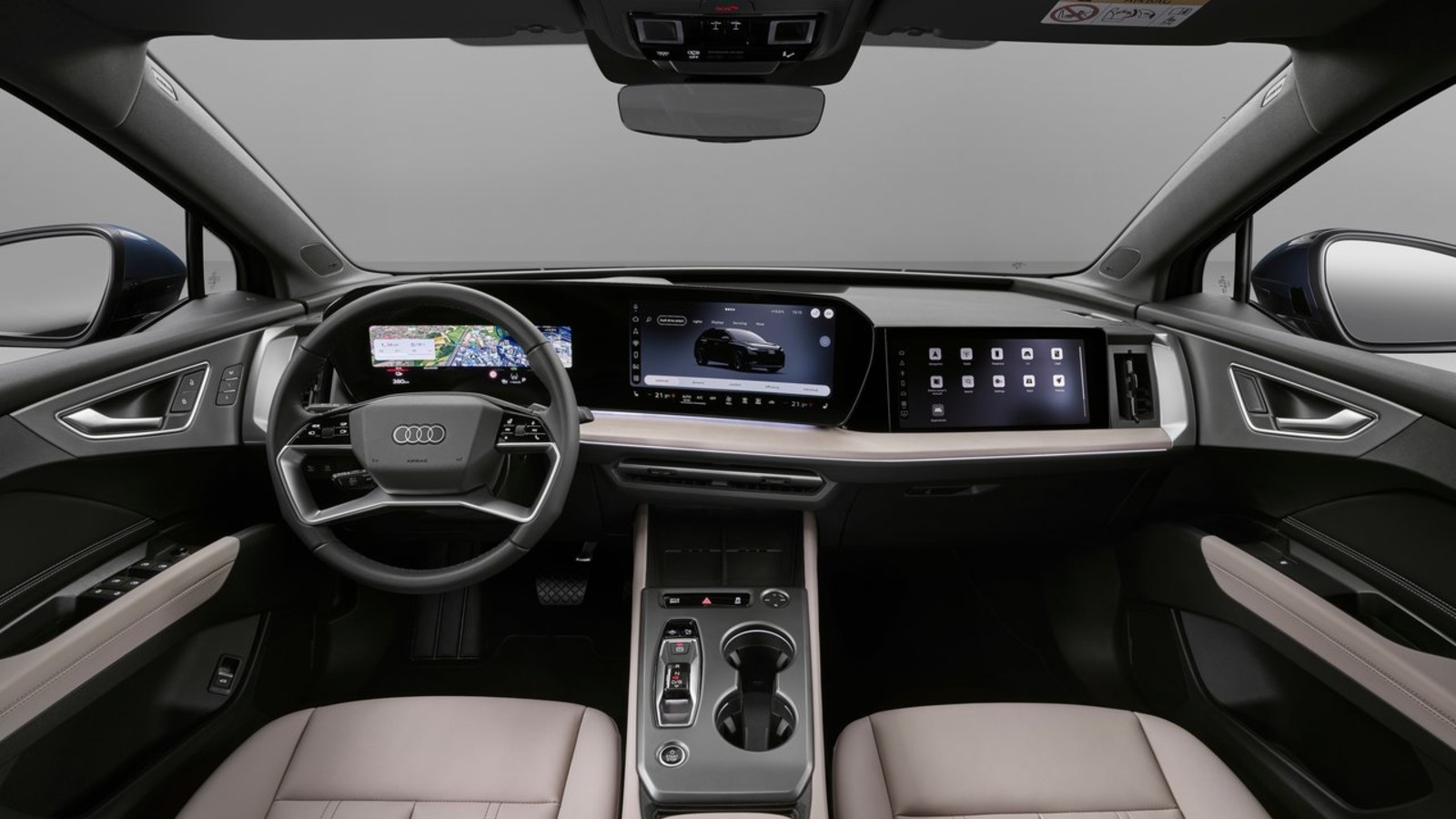 Mientras el diseño exterior del Audi Q4 e-tron cambia poco, en el interior los cambios son más evidentes. Encontramos un nuevo salpicadero, que ahora incorpora dos pantallas digitales, una de 12,8 pulgadas para el sistema multimedia con sistema operativo Android Automotive y otra de 11,9 pulgadas para el cuadro de instrumentos. Opcionalmente, puede haber una tercera para el acompañante de 12 pulgadas, como ocurre en los últimos lanzamientos de la compañía de los cuatro aros.