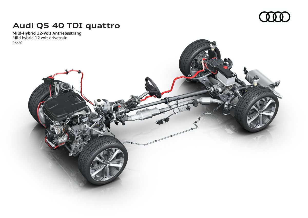 A nivel mecánico, las principales novedades que ha incorporado Audi en la gama del Q5 2021 las encontramos en la mecánica 40 TDI, un motor de 2.0 litros turbodiésel de 204 CV de potencia y 400 Nm de par motor con cambio automático S tronic de doble embrague. Hasta aquí todo normal, pero destaca el sistema Mild Hybrid que integra un motor eléctrico-arrancador y una pequeña batería con la que se contribuye a reducir consumos (hasta 0,3 l/100 km, según Audi) y a perfeccionar el sistema start-stop del vehículo, que ahora actúa por debajo de 22 km/h. Luce la etiqueta ECO de la DGT.