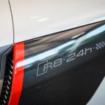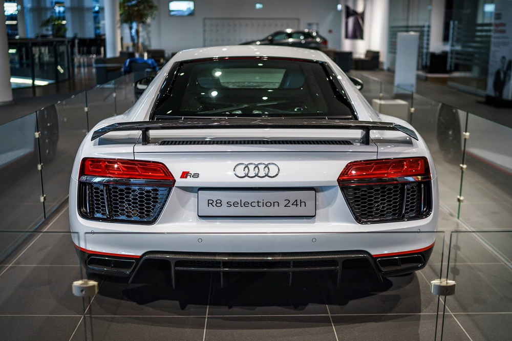 El splitter delantero, las carcasas de los retrovisores, la cubierta del compartimento del motor , el alerón trasero y el difusor están realizados en fibra de carbono con acabado brillante. El mismo material, pero en terminación mate, lo encontramos en los sideblades laterales con el logo 'R8 24h'. Rematando el conjunto exterior del Audi R8 Coupé V10 Plus 'Selection 24h' tenemos las salidas de escape deportivas terminadas en negro, así como las llantas de 20 pulgadas con un acabado negro antracita brillante.
