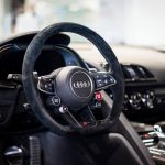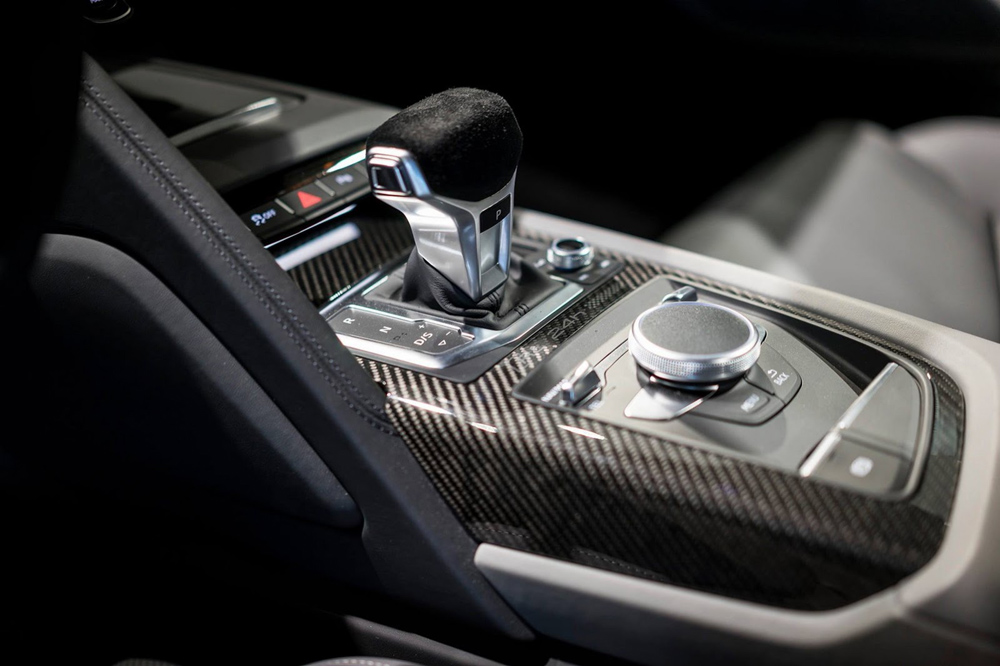En el interior de esta edición limitada 'Selection 24h' del Audi R8 V10 Plus encontramos una tapicería completa de piel y techo en Alcántara, diferentes detalles en fibra de carbono distribuidos por el salpicadero, así como detalles en terminación brillante con logotipos 'R8 24h' en mate. Las molduras iluminadas en los umbrales de las puertas también están relizadas en carbono con acabado brillo y muestran el número de la serie, del 1 al 24, para cada uno de los coches de la edición limitada.