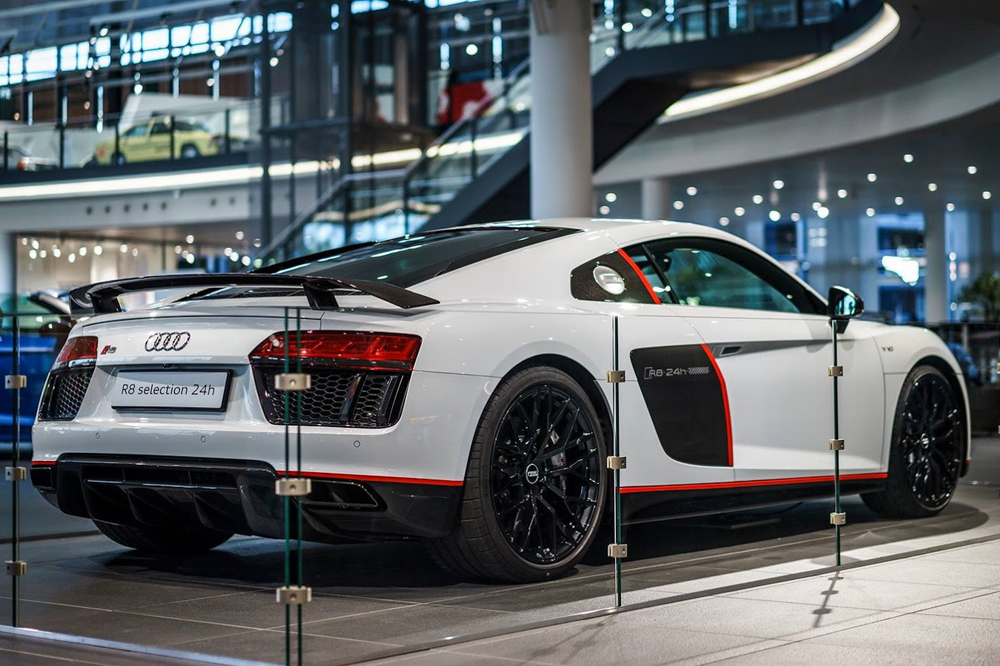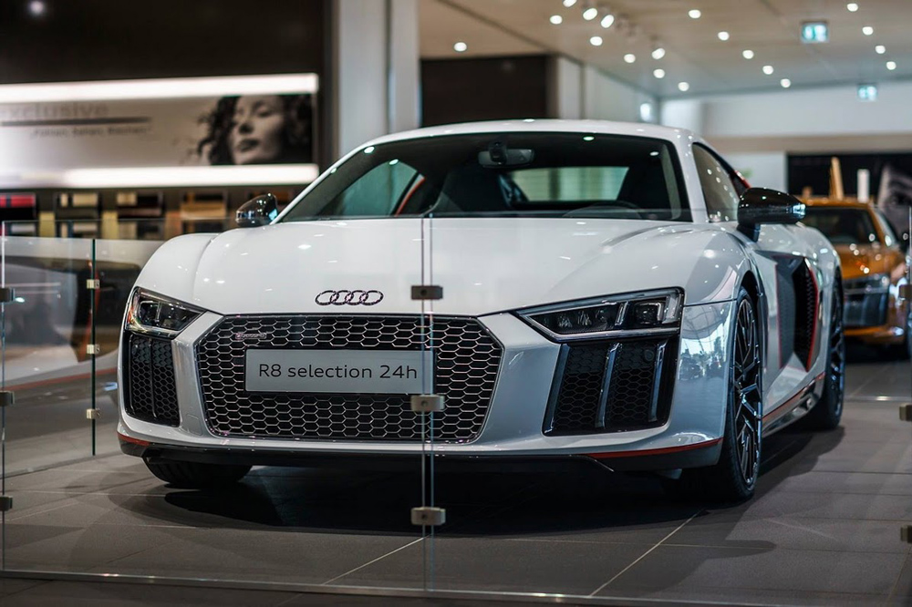 Con motivo de la victoria en su debut en la categoría GT3 de las 24 Horas de Nürburgring, los chicos de Ingolstadt lanzaron el Audi R8 Coupé V10 Plus 'Selection 24h', una exclusiva edición limitada a 24 unidades. Cuenta con una decoración exclusiva de la serie, el potente motor del R8 V10 Plus y una paquete técnico asociado a la edición especial. Ya se aceptan pedidos por un precio, en Alemania, de 229.000 euros. Ahora te traemos las primeras imágenes del coche al natural, tomadas en un de los concesionarios más importantes de la marca.
