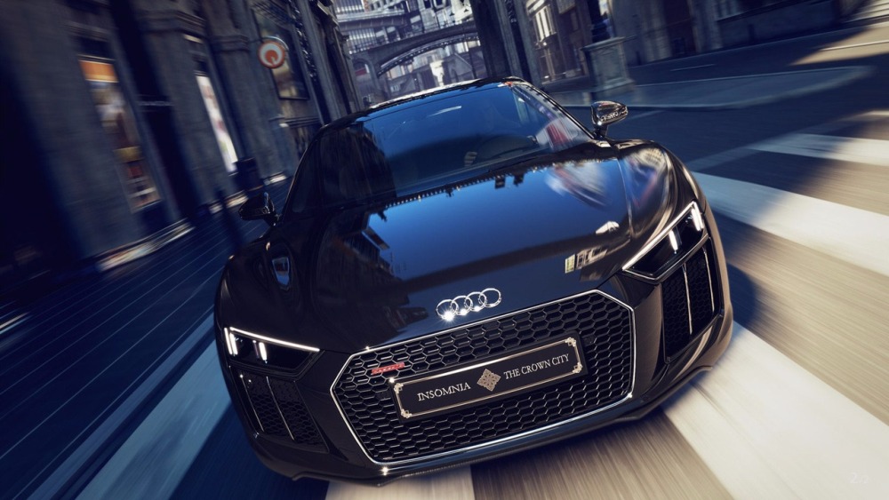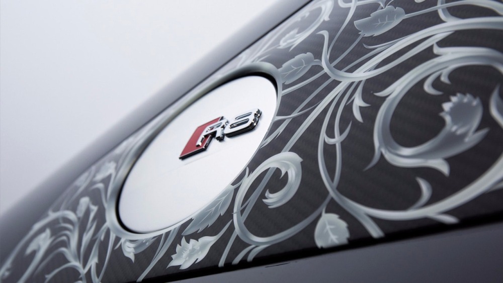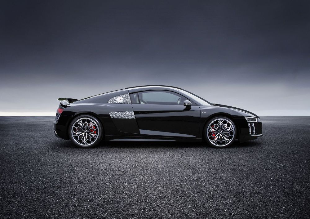 Este ejemplar se basa en el Audi R8 V10 Plus (prueba) y está terminado en negro Ultrossic con un solo toque de púrpura. Los elementos característicos de fibra de carbono disponibles en la versión Plus del deportivo alemán están rematados en un patrón tradicional floral relacionado con el clan Tenebrae de ‘Final Fantasy XV: Kingsglaive’, el cual lo podemos encontrar en el parachoques, los espejos retrovisores, las entradas de aire, el spoiler y los side blades.