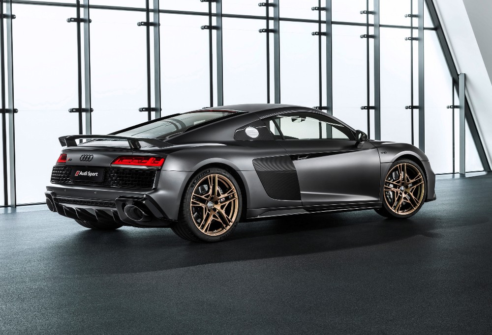 Terminado en color exclusivo gris Daytona con efecto mate, el R8 V10 Decennium porta llantas de 20 pulgadas y el colector de admisión del motor en color bronce mate. El splitter delantero, los faldones laterales y el difusor trasero presente el color negro brillante y se complementan con los distintivos aros de Audi en color negro. Los famosos side blades laterales y las carcasas de los espejos retrovisores están acabados en fibra de carbono brillante.